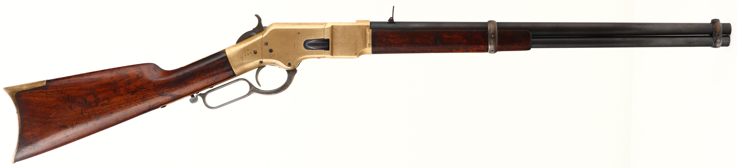 Winchester, Model 1866 Saddle Ring Carbine, 2nd variation, .44 Henry Cal., MFG. 1869, SN: 21808, Lever Action Rifle, 20'' Round barrel, Full mag. Rare early carbine with a Henry marked barrel. The address atop the barrel is still very sharp. The original wood stocks are excellent & solid. The stocks original finish has thinned & darkened from use & oils, with some added oils or protective finish. Stock has a repaired chip in the upper left corner of the tang & a small missing chip at the right corner. There are handling marks, scrapes & small contusions. The barrel & mag display 85% coverage of what appears to be the original metal blue finish, with some added finish in areas of previous wear or light pitting. The blue is starting to tone to a brown patina in areas of thinning. The lever & hammer retain muted remains of case-colors. The brass receiver & buttplate have a nicely aged patina. Bore is excellent. The barrel carries the original flip-up rear sight, with 1,3 & 5 markings for 100, 300 & 500 YDS & a standard pinch blade barrel band front sight. Stock carries a brass trapdoor crescent buttplate. A staple mounted saddle ring is located on the left side of the receiver. The numbers ''282'' are stamped on the rear portion of the right side of receiver. The SN is stamped on the lower tang. Tight, smooth action & appears mechanically sound. This early 1866 SRC has a wonderful aged appearance & these rifles are hard to find in this well maintained condition.* Antique, No FFL Req. - Value: 15000 to 18000