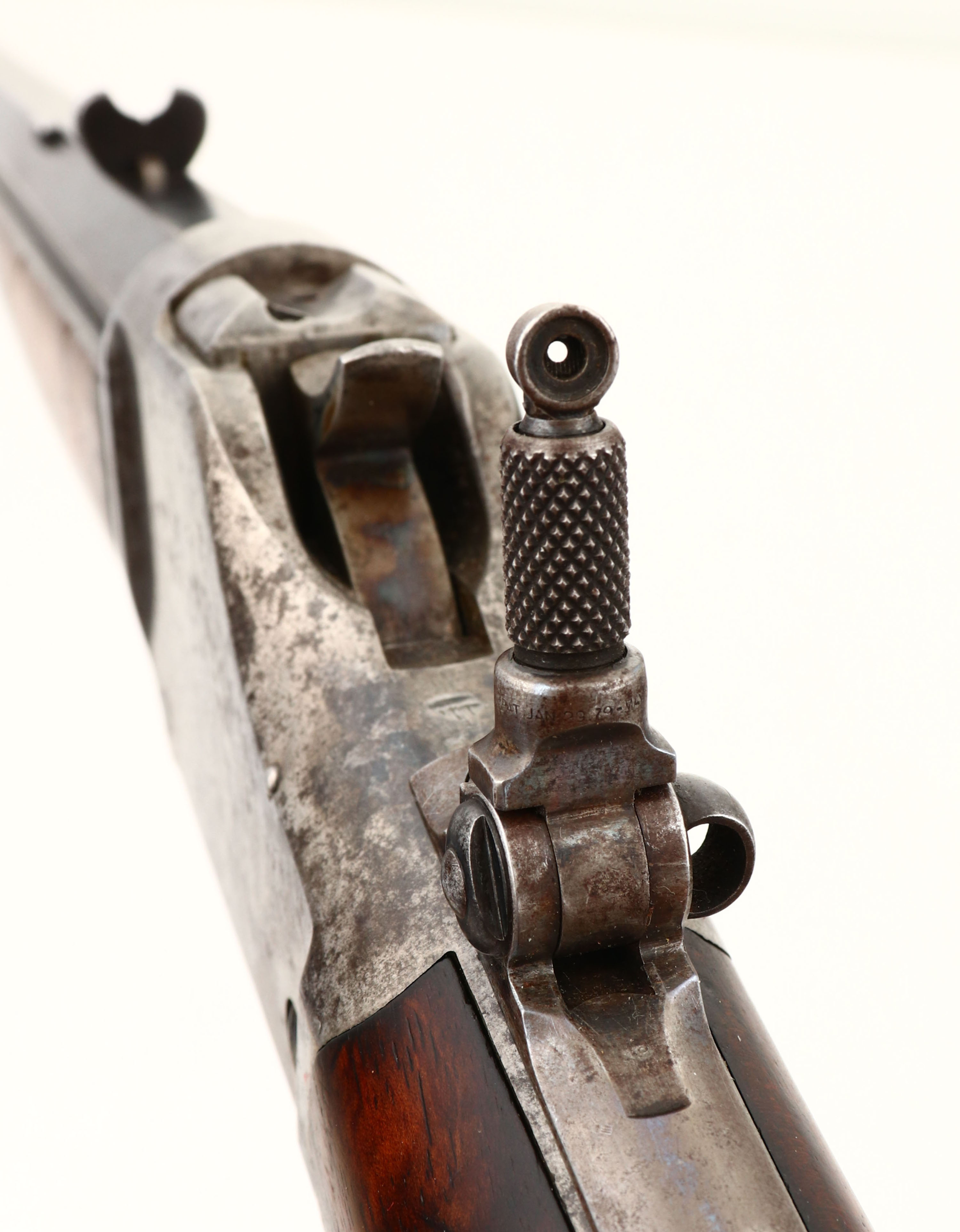 RARE, Winchester Model 1885 High Wall, CAL: marked 32-40, MFG: 1891, SN: 45048, Lever Action Falling Block Single Shot Rifle, 30'' #3 stamped octagon barrel. The Special Order straight grip Deluxe ''X'' grade wood stock & inlayed ebony tip forearm are excellent & rare. It is unusual to order non-checkered deluxe grade wood. The grain & contrast of the wood is fabulous. The finish shows thinning & flaking. There is two tight grain cracks on the left side of wrist emanating from the upper & lower tangs, an some other minor contusions, scrapes & scratcher. The barrel retains 70% coverage of original blue finish toning to a brown patina as it thins. The case-hardened receiver, level & hammer have all worn gun metal gray, with shadowy outlines of case-colors & spotty brown patina. The barrel is a #3 weight barrel, as stamped ahead of the forearm & under the forearm, as is the matching caliber marking. Bore is very good, with areas of roughness amongst the proud rifling. The receiver is fitted with a Lyman flip-up adjustable tang sight, while the barrel carries an adjustable rear & small blade front sights. Buttstock carries a smooth, crescent metal buttplate. Plain trigger. Comes with a Cody Winchester Factory Records Letter confirming the configuration, deluxe ''x'' wood & dates. A wonderful & original special order 1885 high wall. Antique, No FFL Req - Value: 4000 to 6000