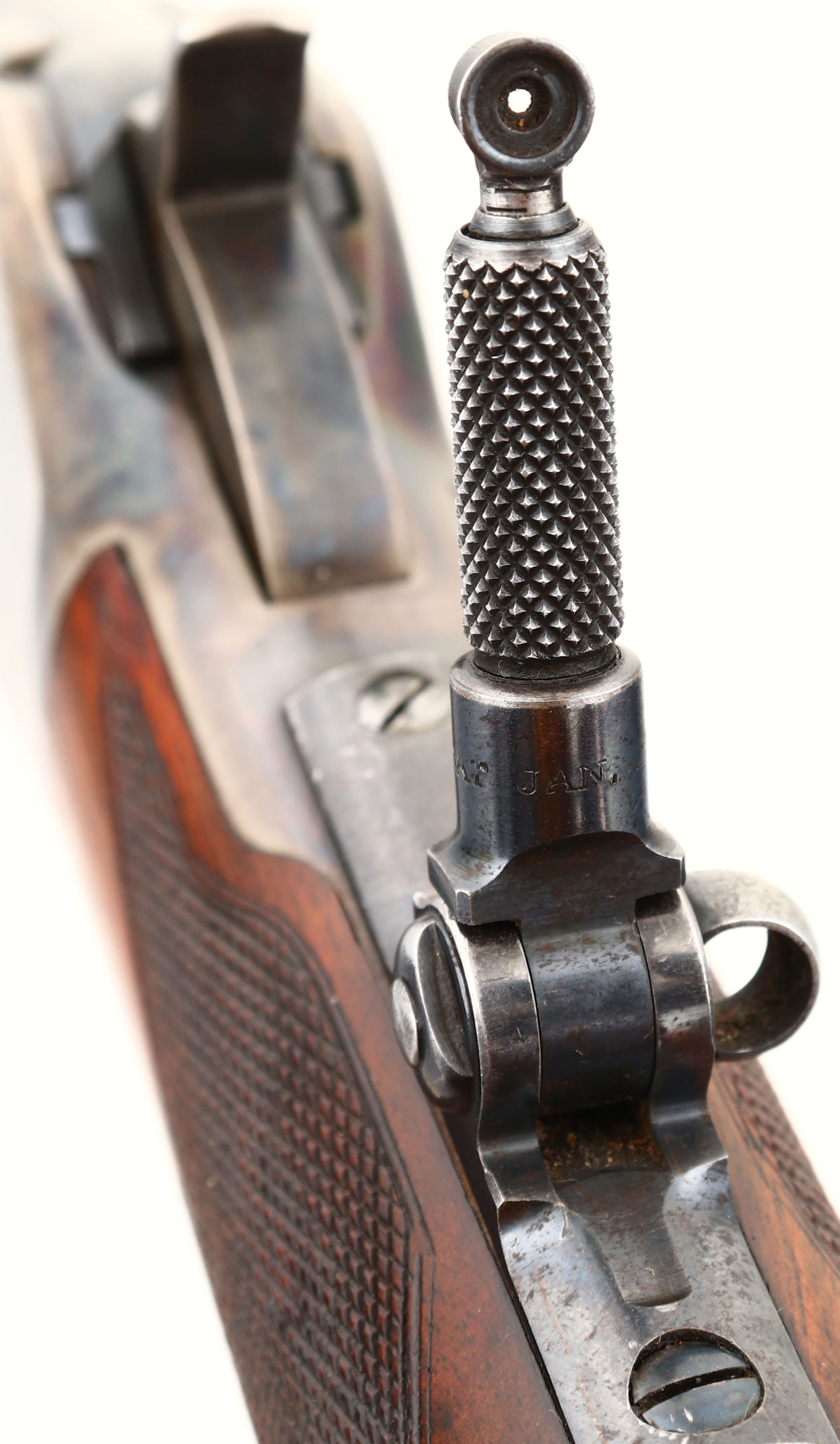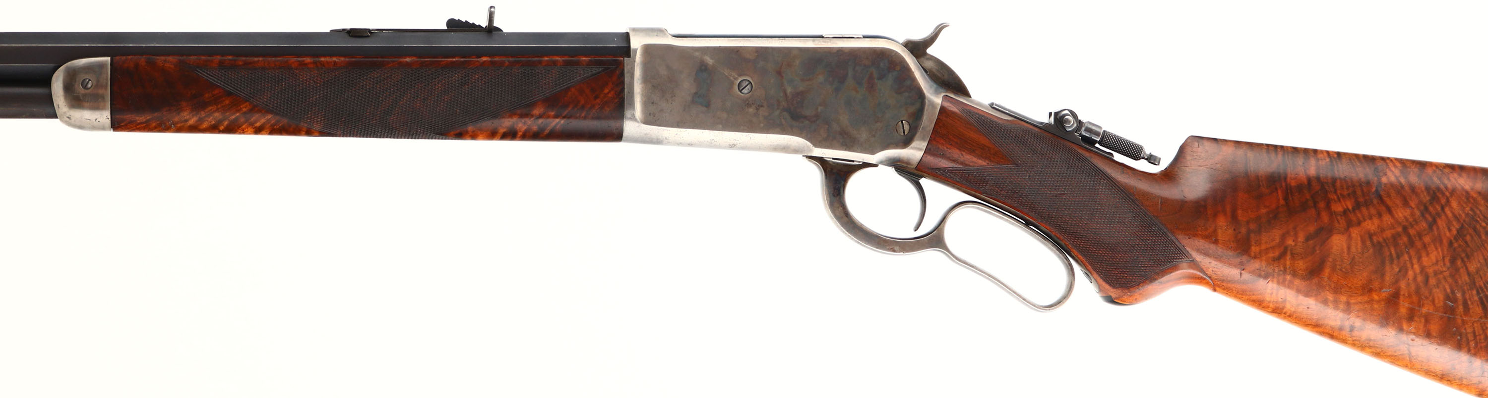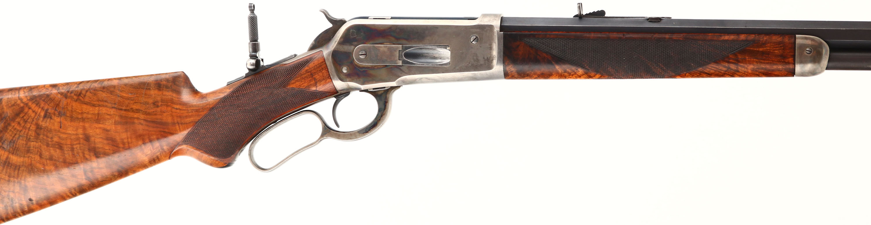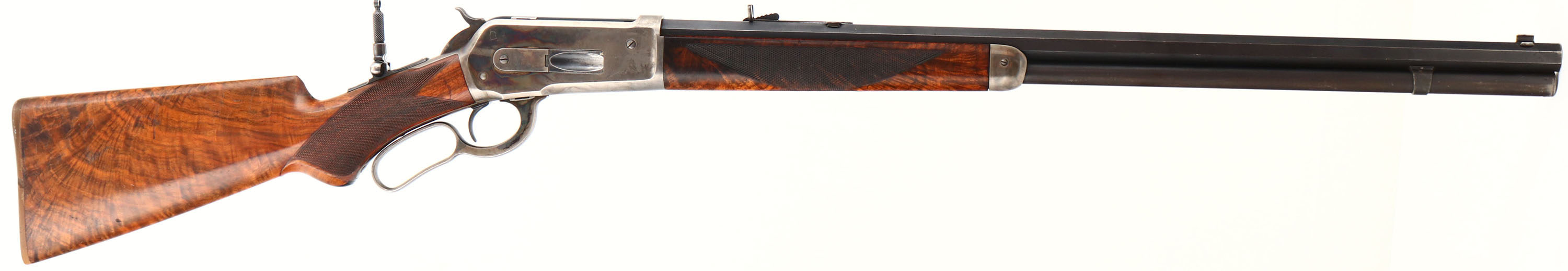WONDERFUL Winchester, Model 1886 Deluxe, CAL: 45-90 WCF, MFG: 1892 (Antique), SN: 64010, Lever Action Rifle, 26'' Octagon barrel, Full mag. Special Order Rifle. Mounted with fantastic, center crotch, rippled grain American walnut with ''H'' style checkered forearm, serpentine pistol grip stock with a black triangle inlay & a Winchester hard rubber, widow's peak, shotgun style buttplate. The stocks are excellent, with a majority of the original finish remaining & a few small contusions, scuffs & handling marks. The original metal blue finish on the barrel rates 97%, 95% on the mag, with areas of thinning starting to tone to a brown patina. The receiver, lever, hammer, & forend cap are all case-hardened, displaying beautiful case-colors. The sliding bolt retains a full 95% of the original bright blue colors. The sliding bolt retains 97% of its original bright blue. The receiver is fitted with a Lyman adjustable flip-up tang sight, while the barrel carries an original adjustable rear & blade front sights. Bore is excellent, with a couple of spots of roughness. This Special Order deluxe rifle is in excellent high condition & a very collectible case-colored 1886.* Antique, No FFL Req. - Value: 20000 to 30000