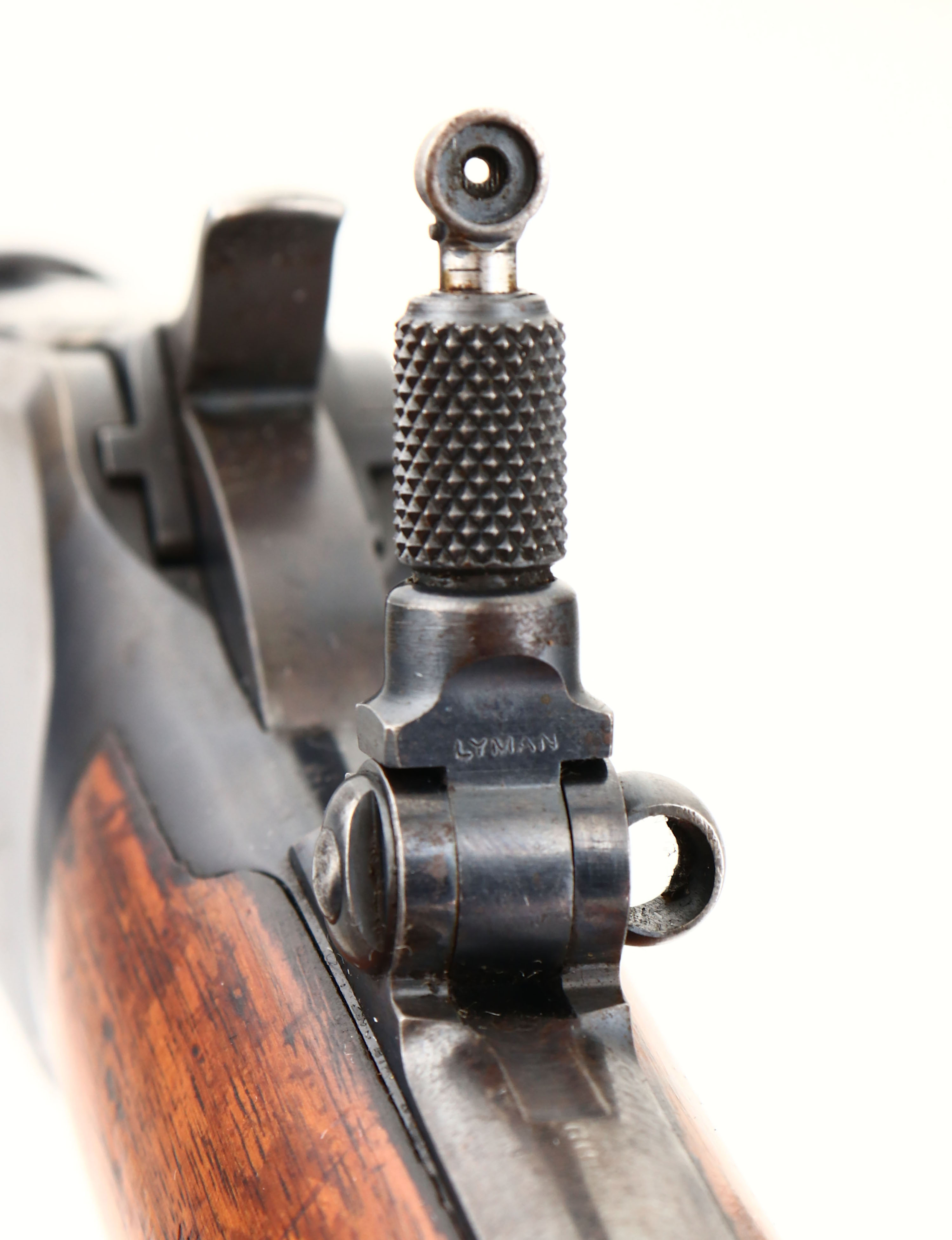 EXCELLENT Winchester, Model 1892, marked 32 WCF, MFG: 1908, SN: 422499, Lever Action Rifle, 24 1/4'' Octagon barrel, Full mag. The original straight grip wood stocks are excellent & solid, with the majority of factory finish remaining, Minor handling dings, scratches & blemishes. Metal displays 95% coverage of original blue on barrel & mag, 85% on receiver, with loss at natural carry points on belly of receiver. Some remains of case-colors on lever & hammer. Crisp barrel lettering & markings. Bore is excellent, but with a couple of spots of roughness. The rifle is fitted with an upgraded sight package of a Lyman flip-up tang sight, a folding leaf adjustable rear & an Ivory bead Lyman front sights. Stock carries a crescent metal buttplate. Special order double set triggers. Tight smooth action. An excellent, all original, & highly collectible special order 1892.* FFL or C&R Req. - Value: 4500 to 6500