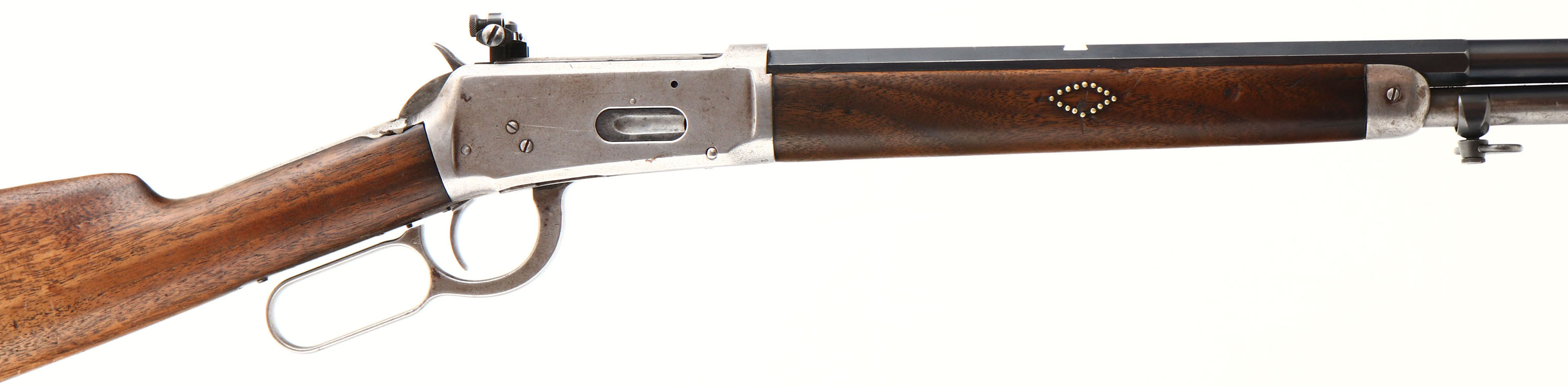 Winchester, Model 1894, CAL: 32 W.S, MFG: 1902, SN: 245243, Lever Action Rifle, 25 1/2'' Half octagon half round barrel. The original straight grip wood stock & forend are good. The stock has a couple of 2'' cracks at the toe, along with a bit of edge chipping, minor contusions & scrapes. The forend has brass decorative pins either side in a diamond configuration & has a couple of short hairline cracks on the right side, as well as other contusions & dings. The barrel is a ''Winchester'' marked replacement, with a circle ''P'' stamp. The factory metal blue finish on the barrel rates 85%, with some scuffs & blemishes. The receiver & tube has worn to gun metal gray, with thin brown patina in protected areas. The upper tang was damaged & has a weld repair behind the hammer. Bore is excellent & bright, with crisp rifling. The barrel has a open rear dovetail & a Marbles Sheard blade front sight. The receiver holds a side mounted Lyman 66A peep sight. Buttstock carries a crescent metal buttplate. Sling loops on stock & mag. FFL or C&R Req. - Value: 400 to 800