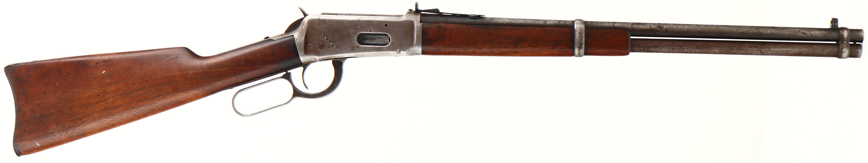Winchester, Model 94 SRC, CAL: 32 W.S., MFG: 1925, SN: 957949, Lever Action Rifle, 20'' Round barrel, Full mag. The original straight grip wood stocks are good & solid, as lightly sanded & reoiled. The stock has an edge chip at the heel, & both has minor contusions, scrapes & dings. The metal blue finish has worn to a gun metal gray, with a thin, spotty layer of brown patina. Bore is very good, moderately rough, with proud rifling. The barrel holds a replaced adjustable rear sight & block elevated blade front sight. Stock carries a carbine style metal buttplate. Saddle ring is missing. FFL or C&R Req. - Value: 400 to 800