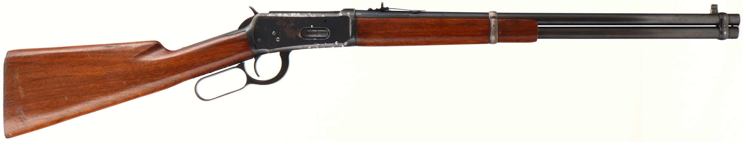 Winchester, Model 94, CAL: 30 WCF, MFG: 1928, SN: 1042328, Lever Action Rifle, 20'' Barrel, Full mag. The original straight grip wood stock & forend are excellent, displaying small scrapes, dings & contusions to the original finish. The original metal blue finish on the barrel rates 95%, 80% on the tube toning to a brown patina as it thins. The receiver rates 70%, with large spotty areas of flaking toning to a brown patina. Bore is excellent, with crisp rifling. The barrel holds a Marbles adjustable rear sight & Lyman blade front sight. Stock carries a smooth metal buttplate. FFL or C&R Req. - Value: 300 to 600