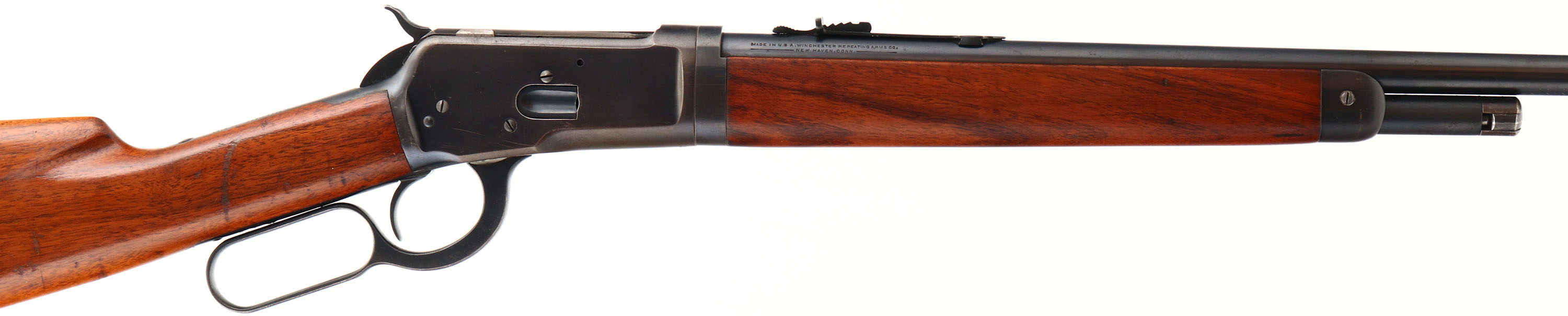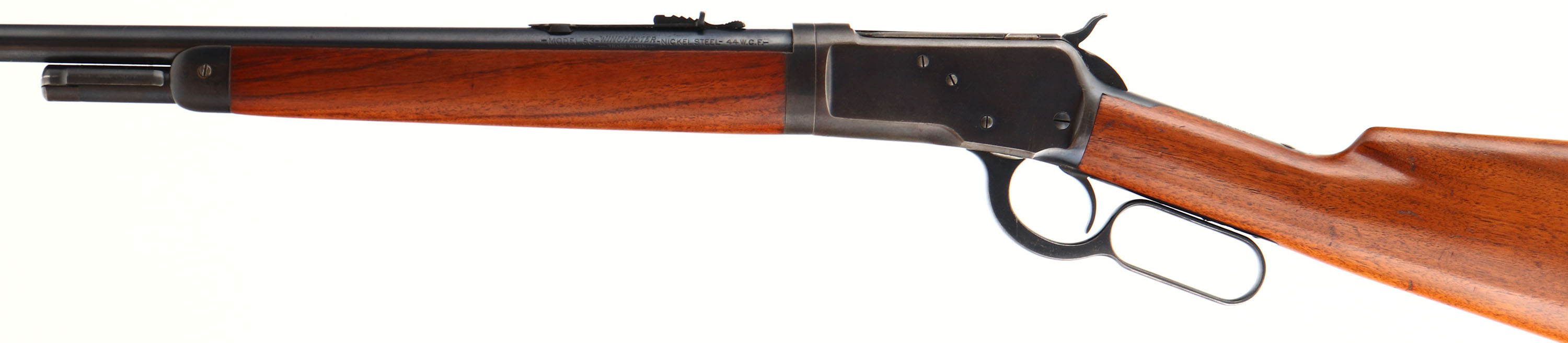 RARE Winchester, Model 53 TAKE-DOWN, CAL: 44 WCF, MFG: 1924, SN: 362, Lever Action Rifle, 22'' Tapered round barrel. Half mag. In 1924, Winchester introduced the Model 53 lever-action rifle as a more modern version of the model 1892. Production lasted just 8 yrs until 1932, with very limited production of approximately 25,000. This rifle is a 1st YEAR PRODUCTION, early 3 digit SN. The original straight grip wood stocks are excellent, with minor surface scrapes, contusions & scratches. There is some flaking of the finish on the buttstock along the edge of the buttplate & thinning of finish on the forend. The metal blue finish on the barrel rates 95%, with small scrapes at the area of the takedown lever. The receiver blue rates 75%, with most thinning wear at the handling points of the belly, which is toning to a light brown/gun metal grey patina. Bore is excellent & bright, with proud rifling. The barrel holds a flat top adjustable rear sight & low profile front sight. Buttstock carries a grooved metal buttplate. A very nice example of a first year, take-down 53 in the very desirable 44 WCF.* FFL or C&R Req. - Value: 6000 to 9000