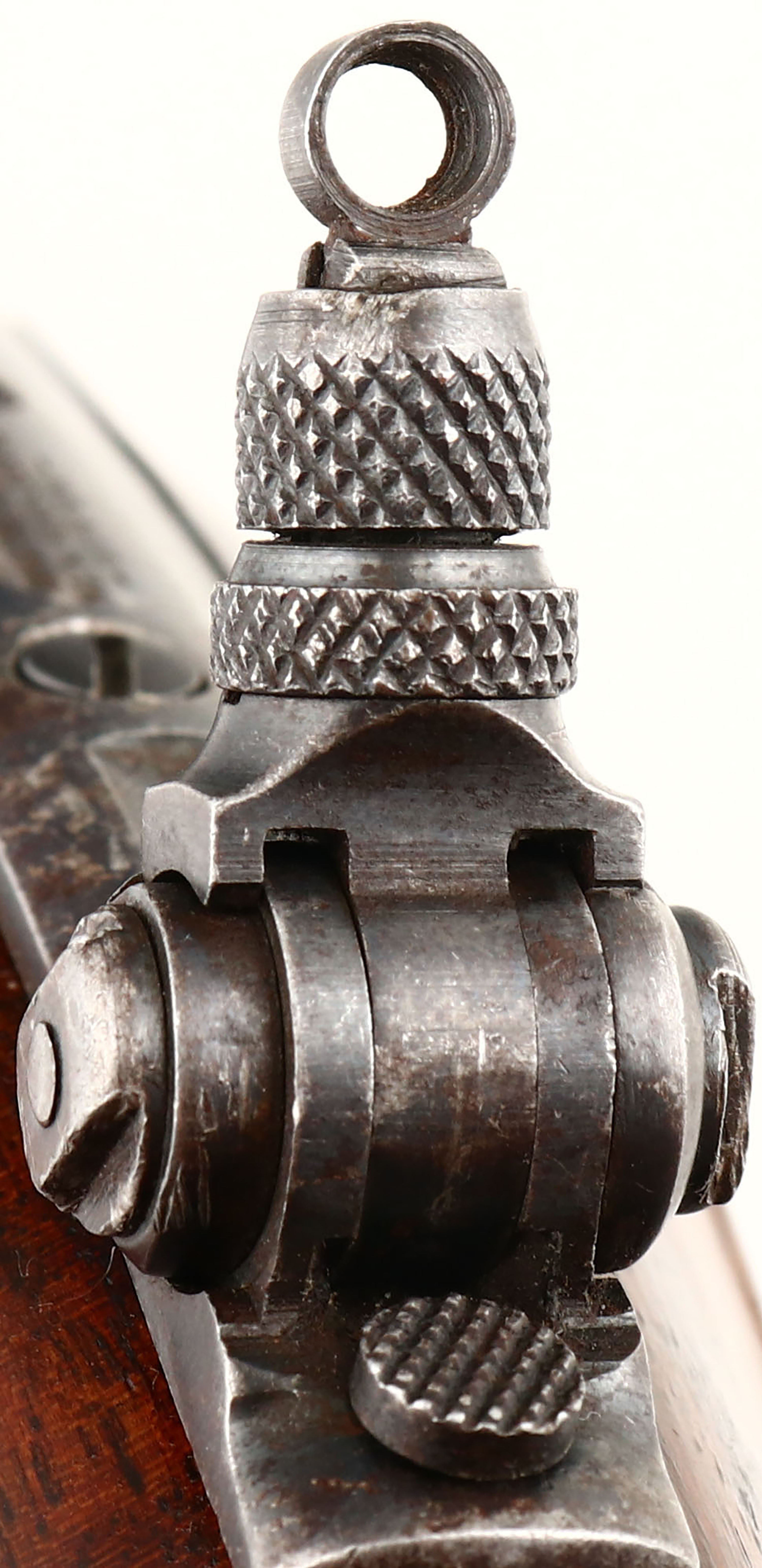 Savage, Model 1899, CAL: 22 H.P, MFG: 1913, SN: 142129, Lever Action Rifle, 20'' barrel. The original straight grip wood stock & forend are very good & solid. There are two tightly repaired hairline cracks emanating from the toe & the finish on the stock was nicely restored & blended to match the original finish. There is some thinning of the finish, along with minor contusions & scrapes to the finish. The metal blue finish rates 85% overall. The lever still displayed case-coloring. Bore is excellent, with strong rifling. The receiver holds a Marbles flip-up tang mounted peep sight. The barrel holds a Savage standard adjustable rear sight & block elevated blade front sight. Round counter on left side of receiver. Stock carries a Savage grooved metal buttplate. A nice take-down 1899. FFL or C&R Req. - Value: 800 to 1500