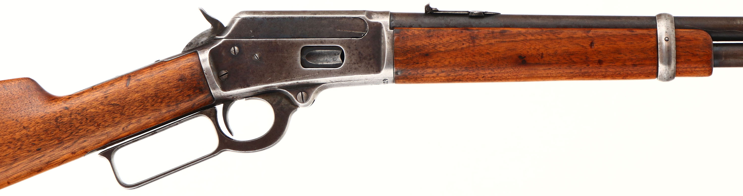 RARE Marlin, Model 94 SADDLE RING TRAPPER, CAL: 44-40, MFG: 1905-34, SN: 423099, Lever Action Carbine, 15'' barrel & mag. This is an extremely rare short barreled trapper which has be recognized by the ATF as qualifying as a curio & relic & is listed by serial number in the ATF C&R booklet as approved as a short barreled rifle (SBR) removed from NFA restrictions. In other words, this carbine is a legal SBR carbine. The original straight grip wood stocks are very good & solid. They carry a thin layer of added finish over the original finish, with several small nicks, scratches & minor contusions. The metal blue finish on the barrel & tube has toned to a brown patina, with some remains of original blue in protected areas. The once blued receiver & case-hardened lever have worn mostly to a gun metal gray, with a thin layer of brown patina. Bore is clean & bright, but with little remaining rifling. The barrel holds a roll over rear sight, with two additional leafs, stamped with a 50 for 50 yds & a 1 & 2 on subsequent leafs for 100 & 200 yds. The front sight is a carbine style small blade on box. Buttstock carries a carbine metal buttplate. Staple saddle ring. These little trappers were extremely popular on the early traplines & are highly desired & collectible amongst lever collectors. FFL or C&R Req. - Value: 4000 to 6000