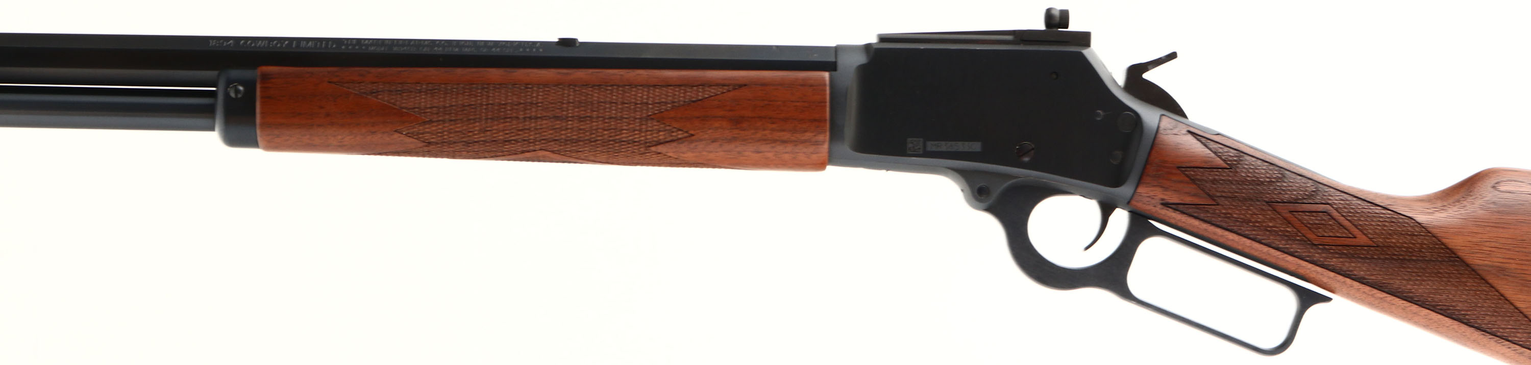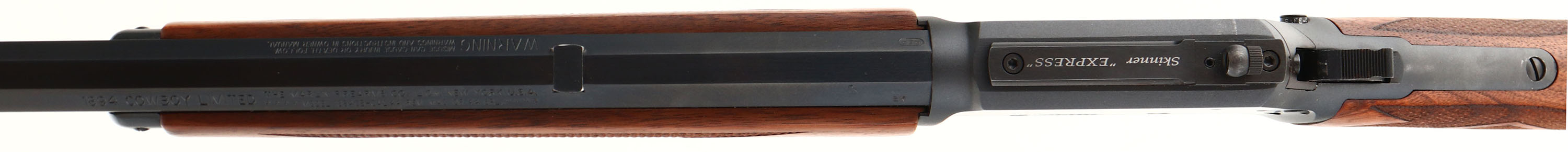 BOXED, Marlin, Model 1894 Cowboy Limited, CAL: 44MAG, MFG: Modern, SN: MR36533G, Lever Action Rifle, 20'' barrel, Full mag. The original checkered straight grip wood stocks are excellent, displaying little to no wear to the factory finish. The metal blue finish rates 99%+ overall. Bore is excellent & minty. The receiver is fitted with a ''Skinner Express'' peep sight & the barrel holds a blank filled rear dovetail & tall blade front sight. Stock carries a Marlin checkered plastic buttplate. Single sling stud & the ''Bullseye'' trademark in belly of the stock. Comes in original box, with attachable barrel sling stud. FFL Req. - Value: 1000 to 2000