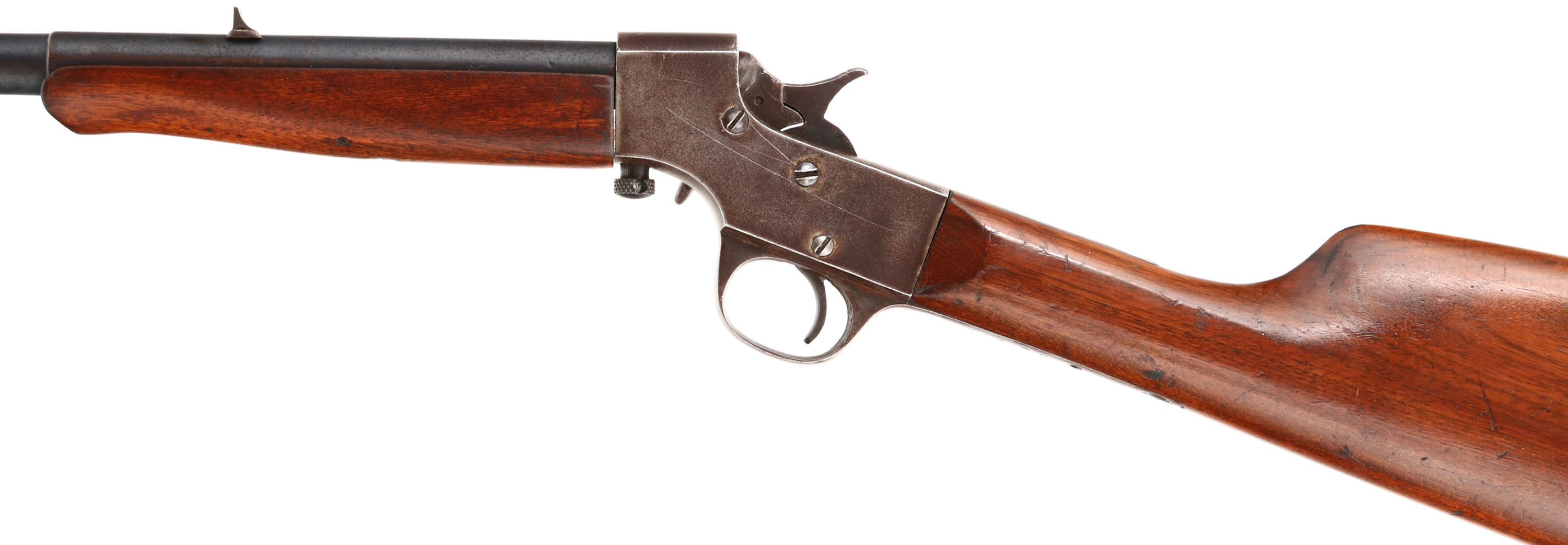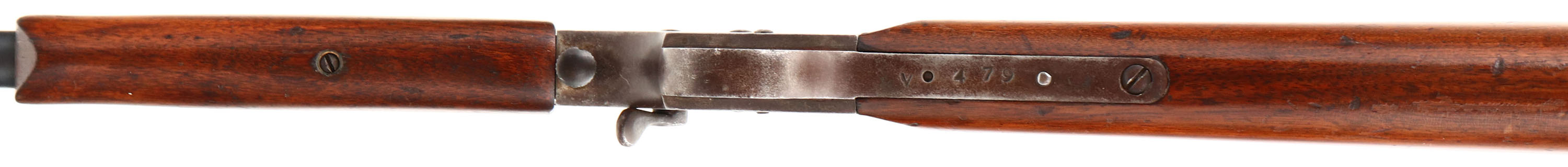 Stevens, Model ''Crack-Shot'', CAL: 32 SHORT RF, MFG: 1913-39, SN: V479, Single Shot Breech Loading Rifle, 20'' Two step barrel. The original straight grip wood stocks very good, with an added layer of finish & displaying contusions & scrapes. The metal blue finish on the barrel rates 80%, with areas of wear toning to a brown patina & some speckling. The receiver has worn gun metal gray with a thin layer of remaining brown patina . Bore is fair, with consistent roughness or light pitting & a ring about 8'' from muzzle. The barrel holds a fixed V-notch rear sight & blade front sight. Buttstock carries a checkered black plastic buttplate. FFL or C&R Req. - Value: 200 to 400