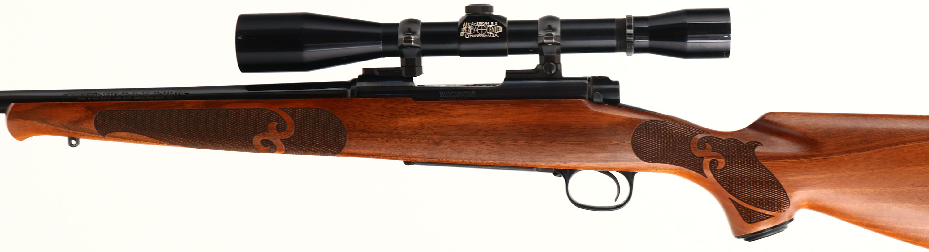 Winchester, Model 70 SA Featherweight, CAL: 22-250 REM, MFG: 1988, SN: G1887812, Bolt Action Rifle, 21 3/4'' barrel. The original checkered & capped pistol grip wood stock is excellent, displaying minor contusions & handling marks to the original finish. The metal blue finish rates 98% overall, with small scuffs & blemishes. The blue on the floorplate appears to be restored, with tiny speckles of rust pitting below the blue. Bore is excellent & bright, with sharp rifling. No open sight provisions. The receiver holds a Perma-Center All American 6x scope. Buttstock carries a Winchester solid rubber recoil pad. Sling stud. An excellent Model 70 Featherweight. FFL Req. - Value: 700 to 1200