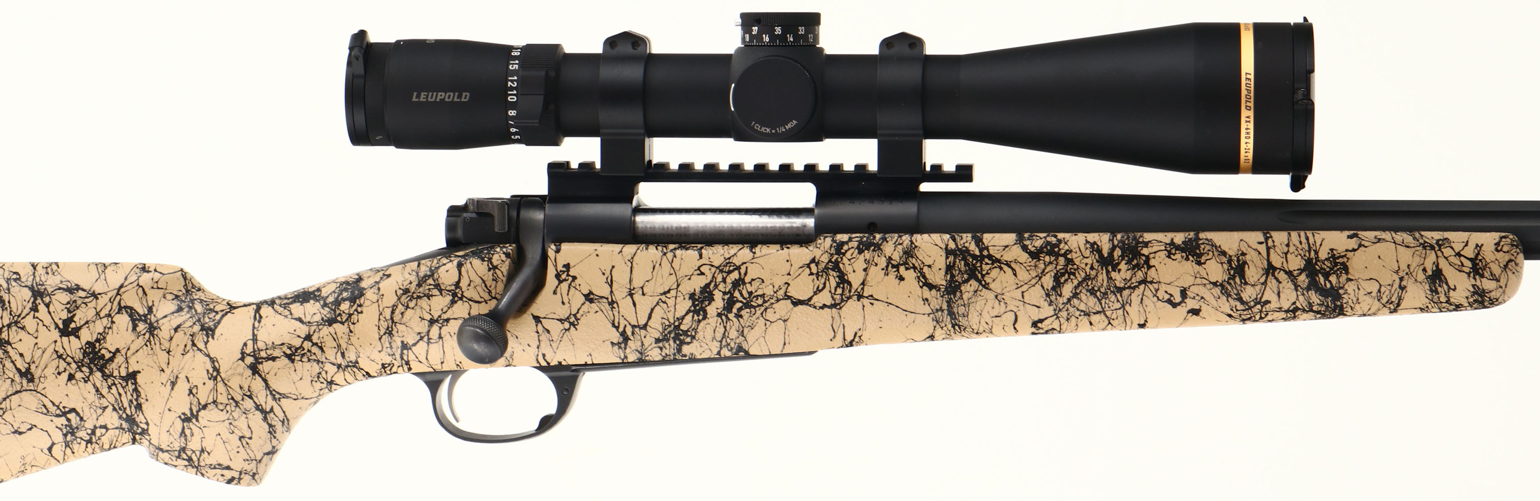 CUSTOM, Winchester, Model 70, CAL: 7mm WSM, MFG: Modern, SN: G2424314, Bolt Action Rifle, 27'' barrel. The custom, cheeked & flat pistol grip synthetic stock is excellent, It carries a wonderful desert tan & black accent finish, with a Jackson Pollock nod, which is also excellent. The custom fluted barrel has a matte, dark gray finish, which is excellent. The matte black finish on the receiver rates 95% overall, with minor surface scuffs. Bore is excellent, with sharp rifling. The picatinny rail on the receiver carries a Leupold VX-6HD 4-24x52 scope & no open sight provisions on barrel. Stock carries a solid black rubber recoil pad. Single sling stud in stock, open hole in forend. A fully customized & nicely equipped Winchester action rifle. FFL Req. - Value: 1000 to 2000