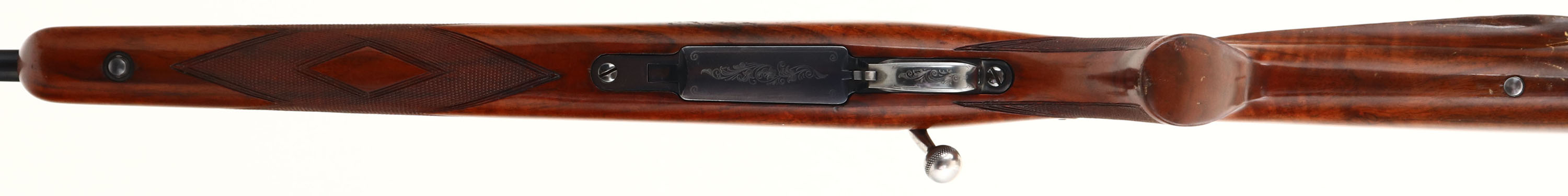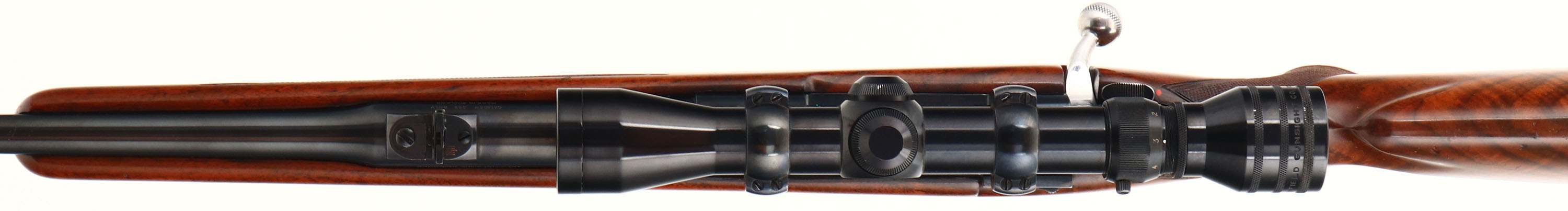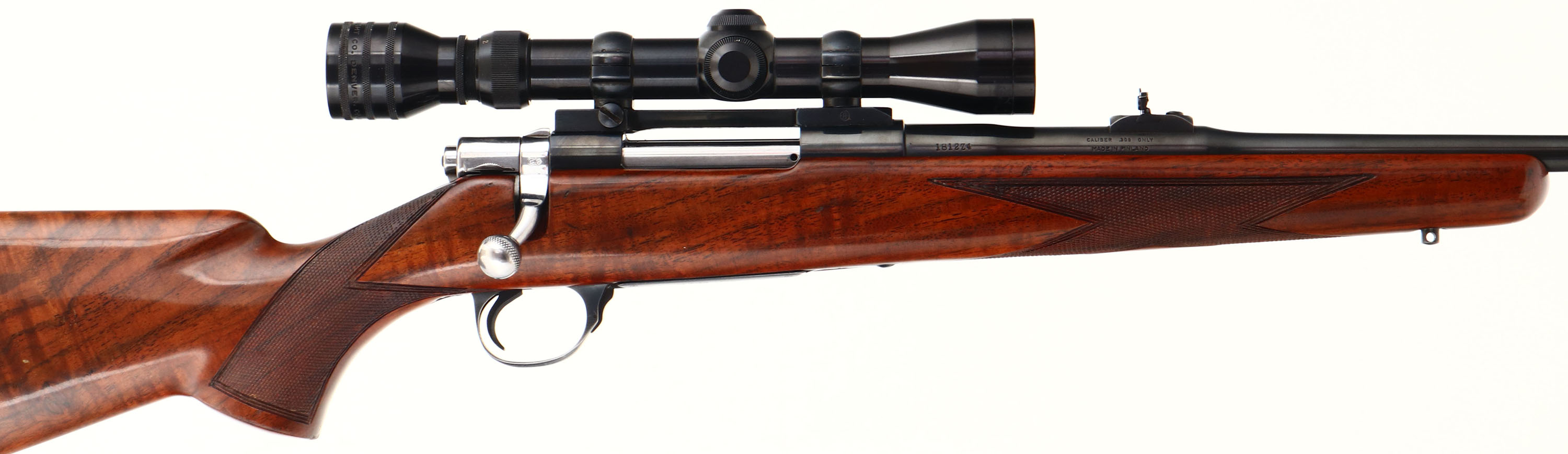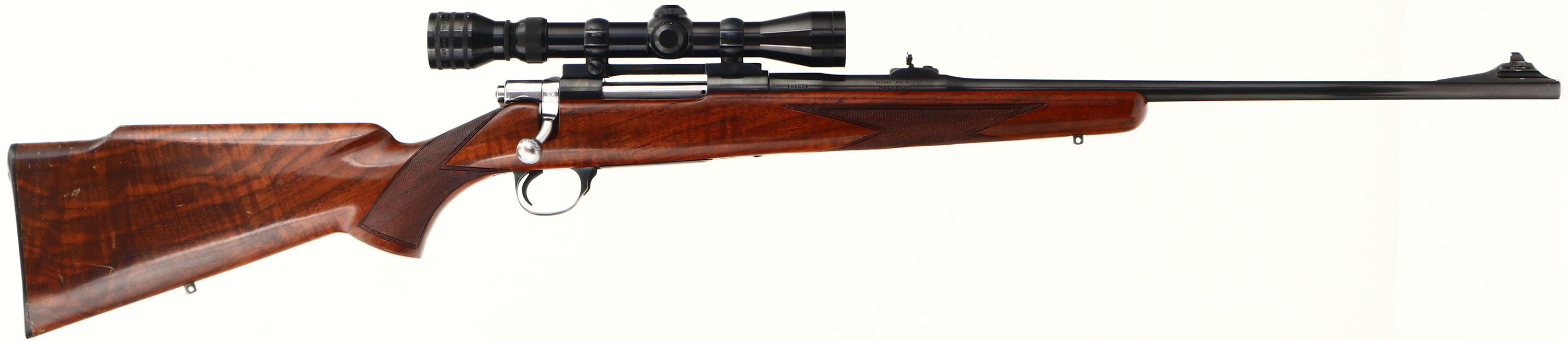Browning, Model ''High Power'', CAL: 308, MFG: 1961-75, SN: 1812Z4, Bolt Action Rifle, 22'' barrel. This sporting rifle was originally produced by FN & was later made by Sako of Finland from 1961-75, which is where this example was produced. The original checkered & flat pistol grip wood stock is very good. It features hand checkering & a raised cheek. It carries the original high luster finish, but with numerous light surface scrapes, contusions & light scratches. The metal blue finish rates 95% overall. The hinged floor plate & trigger guard have a simple scroll & vine engraving. Bore is excellent & bright, with strong rifling. The barrel holds a standard folding leaf rear sight & ramped blade front sight. The receiver holds a Redfield 2x-7x scope on a Redfield mount. The underside of the bolt handle carries the first four digits of SN. Buttstock carries a Browning black plastic buttplate. Sling studs. Comes with a leather sling. A quality made hunting rifle in a popular big game caliber. FFL Req. - Value: 800 to 1500