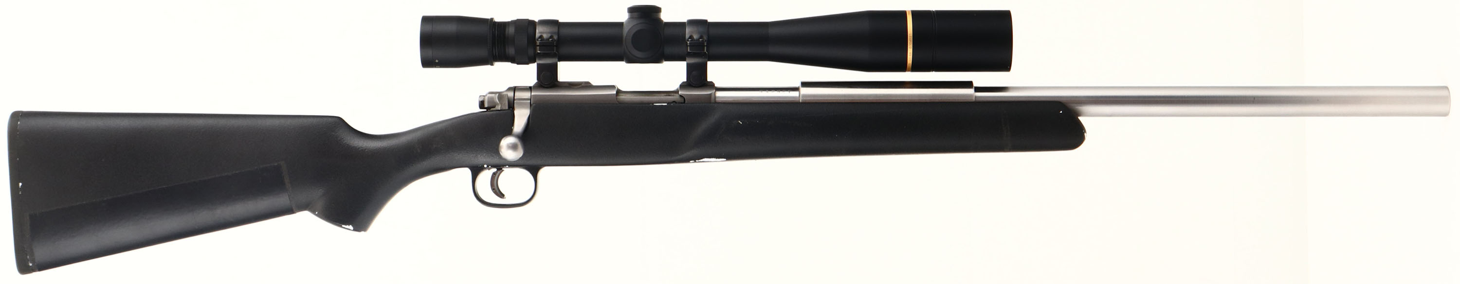 Ruger, All Weather 77/22, CAL: 17HMR, MFG: 2001, SN: 702-50482, Bolt Action Rifle, 22 1/8'' barrel. The custom & flat pistol grip synthetic stock is very good. The stock displays small areas of worn or scraped off texture finish, with an adhesive protective pad running the length of the belly of the stock. Originally calibered in .22, the new custom ''HAPHEY'' .17HMR stainless steel heavy target barrel is excellent. The satin silver receiver is also excellent. Bore is excellent. The receiver carries a Leupold VX-III 6.5-20x40mm Long Range scope, with no open sight provisions on the barrel. Adjustable trigger, currently set to under 1lb trigger pull weight. Stock carries a solid black rubber recoil pad. A very good customized long range target rifle built on the Ruger platform. FFL Req. - Value: 600 to 1200
