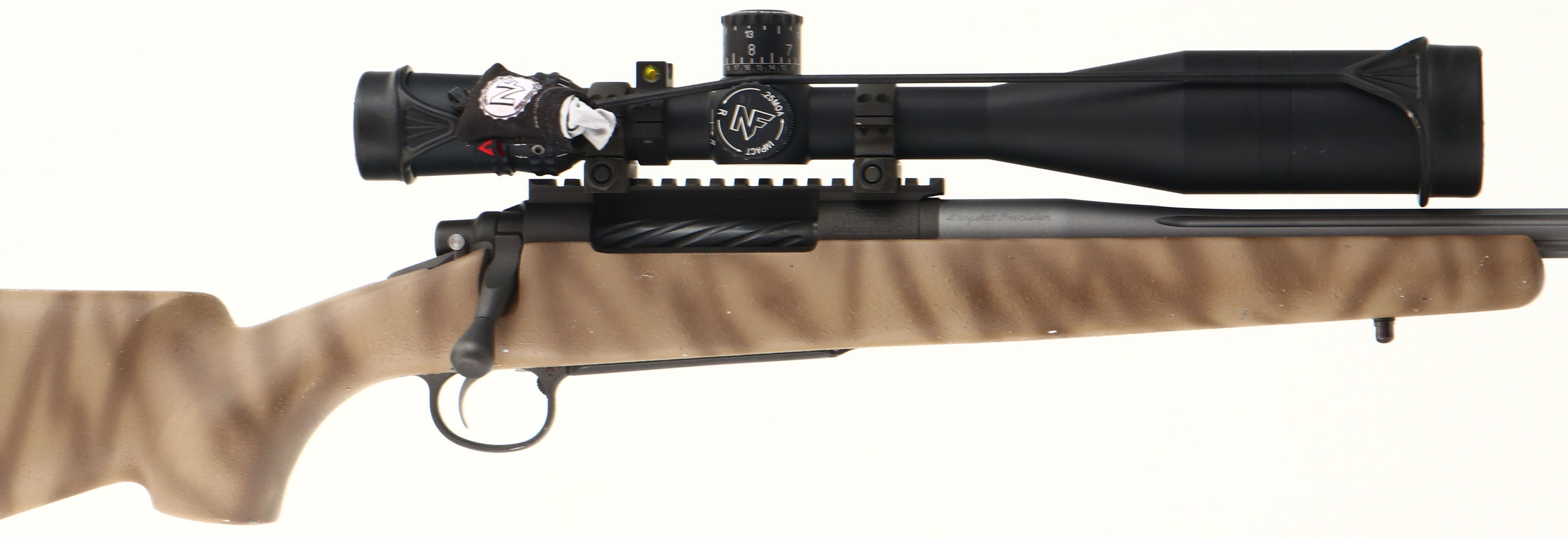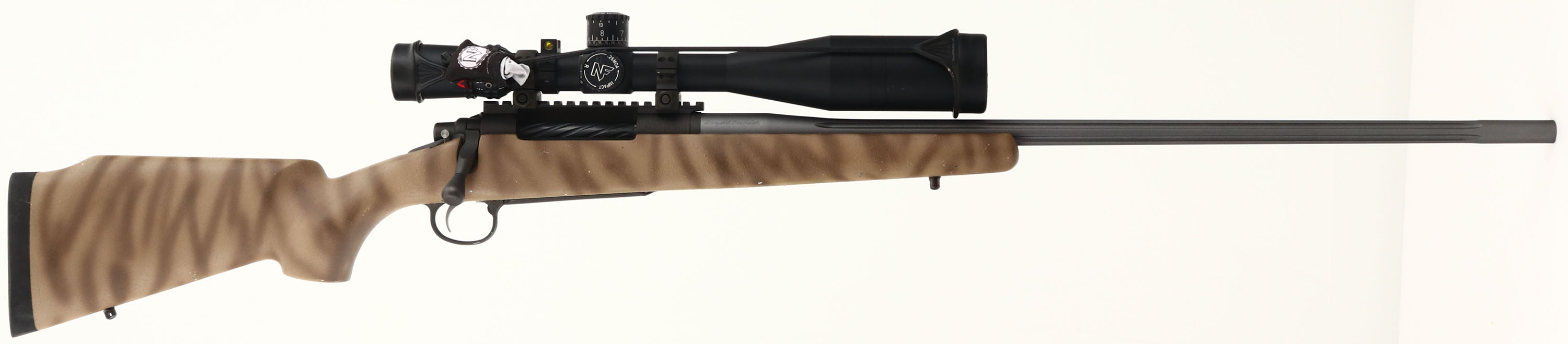 CUSTOM, Defiance, Model ''Rebel'', CAL: 300 WIN MAG, MFG: Modern, SN: NONE, Bolt Action Rifle, 26 1/2'' barrel. This gun was made by a Wyoming custom gun maker. It was originally custom built & auctioned off at a Wild Sheep Foundation event as a fundraiser. The custom, flat pistol & cheeked Monte Carlo synthetic stock is excellent, with a tan tiger striped & textured finish. The finish is excellent, but with a handful of minor scuffs & nicks. The matte gray custom fluted barrel is excellent. The left side of the barrel is stamped with the caliber & the right side is hand engraved ''Longshot Precision''. The parkerized finish on the receiver is excellent. Bore is excellent, near mint. The receiver carries a NightForce NXS 5.5-22x50 scope, while the barrel has no open sight provisions. The stock carries a solid black rubber recoil pad. Sling studs present. Adjustable trigger, currently under 1lb trigger weight. This is a nicely custom built rifle, with a high quality scope. This rifle is in a popular big game hunting caliber & is ready for the hunt! FFL Req. - Value: 1500 to 3000