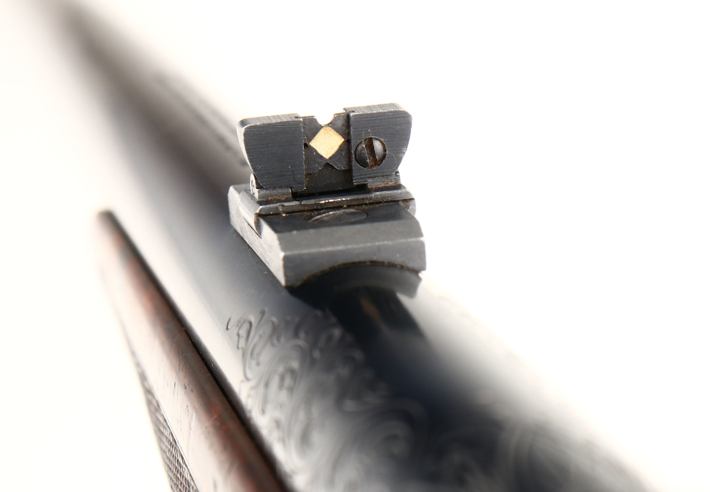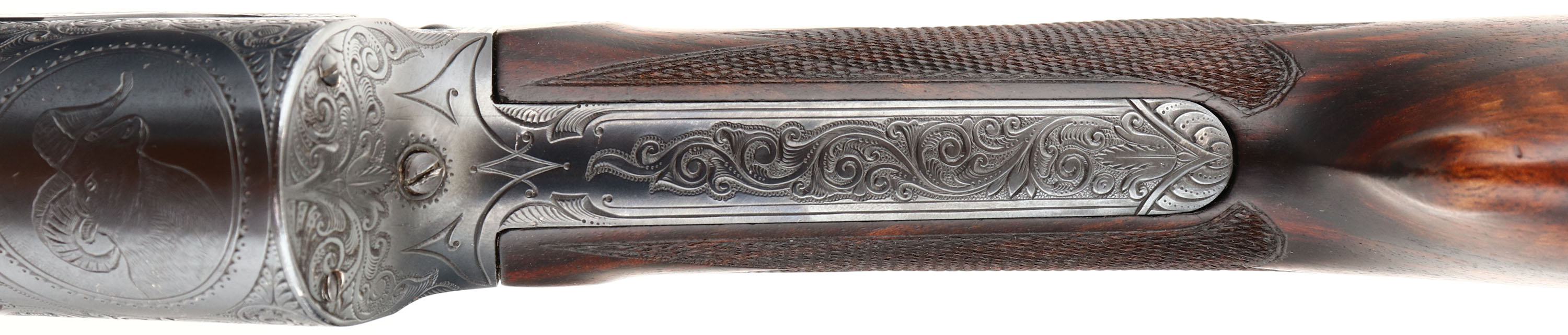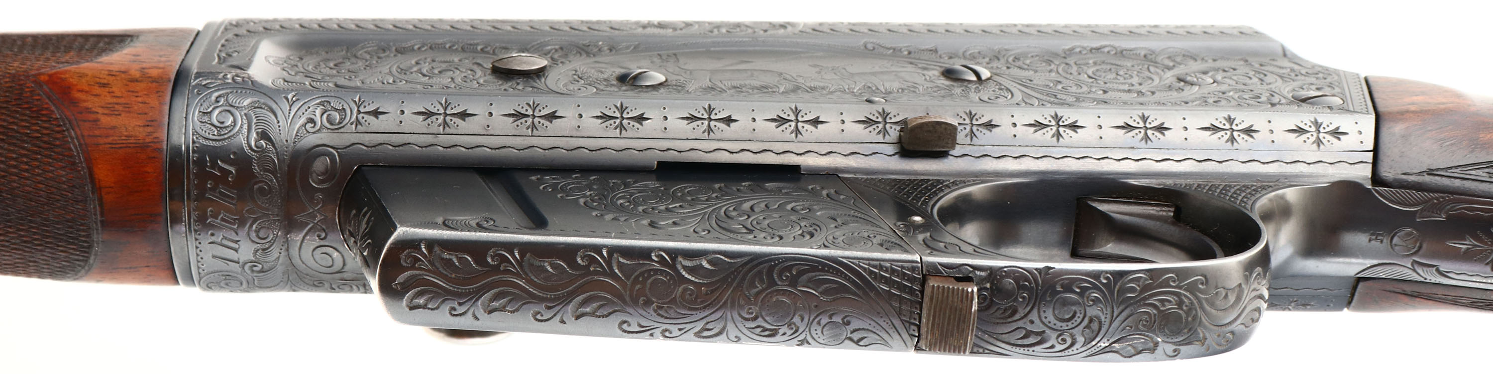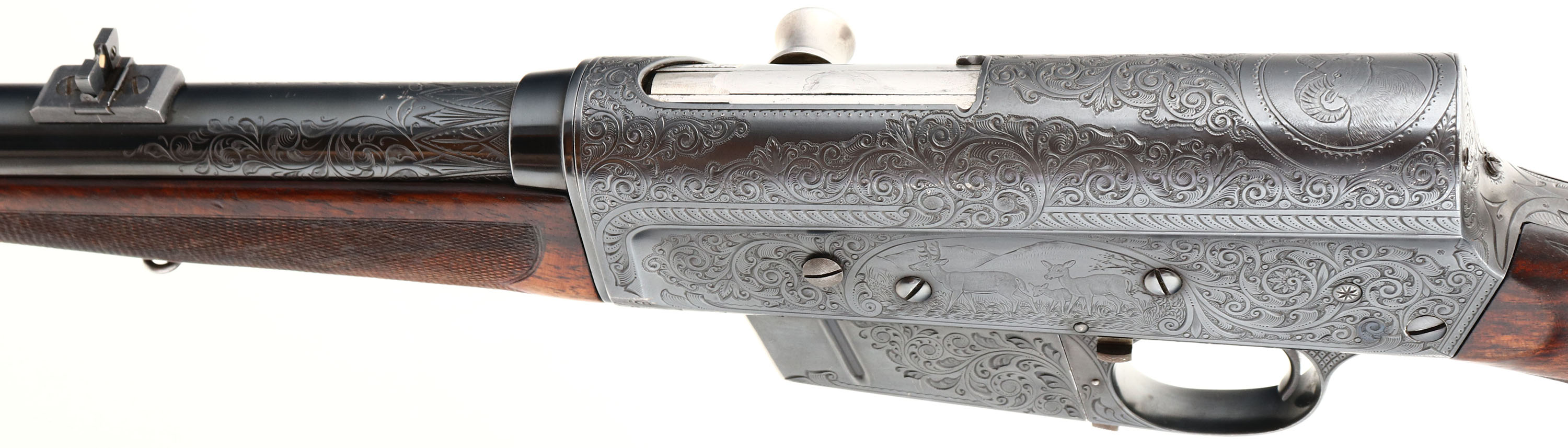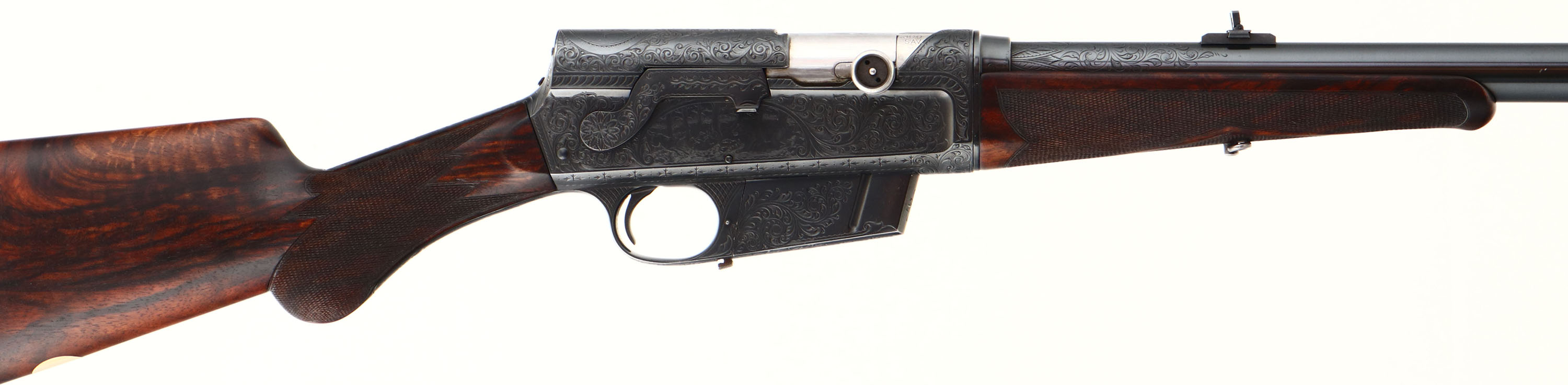 MAGNIFICENT Remington Custom Shop Rifle, Model 8 ''F'' Grade, Marked .300 SAV. Cal., MFG: 1909, SN: 16665, Semi-Auto Rifle, 22'' barrel, This rifle, invented by John Browning, was America's first successful semi auto high-power rifle. It has a 4 shot detachable magazine. These take-down rifles were often broken down into the 22'' & 20'' halves & placed into leather cases for train rides to countryside hunts & shoots. This No. 6 ''Premier or F'' grade rifle was the highest grade rifle Remington offered in their catalog. Factory specifications for the Premier grade read, ''stock & fore-arm of the finest Circassian walnut inlaid with gold name plate & finished with delicate but elaborate checkering. The engraving on this rifle is equal to that on the Premier grade Auto shotgun & is all that could be desired by the most exacting sportsman. All working parts were hand polished in the custom shop. The large receiver side panels are covered with what Remington marketed as ''nearly 100% coverage of deep rich scroll hand engraving, with engraved vignettes on both sides of receiver & a large game head engraved on the top of the receiver.'' In this case, the left side of the receiver has a standing buck deer & two does, while the right side of the receiver displays a black bear tangling with two hunting dogs. The receiver top is engraved with a shoulder mount of a desert ram. Engraving also found on base of magazine, safety, trigger guard, tangs & barrel jacket. The special-order rifle has beautifully contrasting figured grain, while the finely detailed factory checkering is 24 lines-per-inch. This rifle was cherished by its owner & likely was hunted with, especially since the rifle has two very unusual & rare modifications tor a model 8 rifle. The first being that the rifle magazine & receiver was modified to a detachable magazine, with release button located on the trigger guard. This altered the standard fixed mag to allow for easier loading or the opportunity to swap to a possible second or third loaded mag while hunting. The second upgrade to this rifle was a caliber change from its originally produced in 35 Rem caliber. In 1940 Remington added the very popular 300 Savage caliber to its lineup & the owner of this rifle saw the opportunity to upgrade his rifle to this caliber. The rifle would of been returned to the factory where the internal 35 caliber barrel was swapped with a new 300 Savage barrel & associated parts. The outer barrel shroud appears to have had the bluing restored at the same time as the modification as the blue is on the barrel is a bit deeper blue than the original blue it received some 30 plus years prior. While many model 8 rifle were factory modified to the new caliber by their owners, deluxe or factory engraved rifles carrying the 300 Savage caliber are very rare, & one also having the detachable clip modification are virtually non-existent. The factory inlaid gold name plate in stock remains blank. The overall condition of the checkering & wood finish is excellent. The original metal blue finish on the receiver & other metal parts rates 98%. Bore is excellent & bright. Barrel is mounted with a folding leaf rear sight & Marbles #3 front sight. Factory hard rubber buttplate. Any Remington factory engraved firearm is rare, but examples like this highest grade 8 ''F'' are extremely rare. The main reason for this was they were almost cost prohibitive, as according to the 1936 Remington price list, when the Model 8 production ceased, for the cost of one 8 ''F'' grade rifle, one could purchase five 8A's ''standard grades'' rifles & over 600 rounds of factory ammunition. A very unique & extremely rare rifle & an example of the finest early 20th century engraving. FFL or C&R Req. - Value: 10000 to 15000