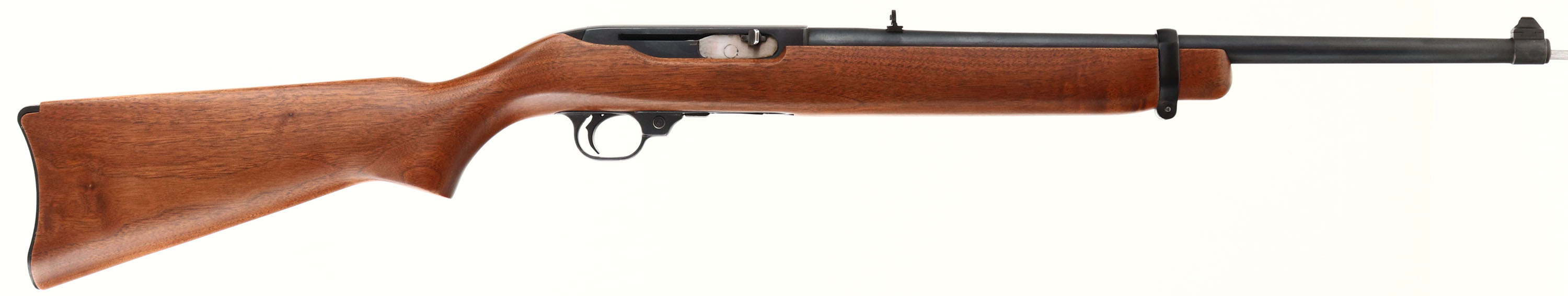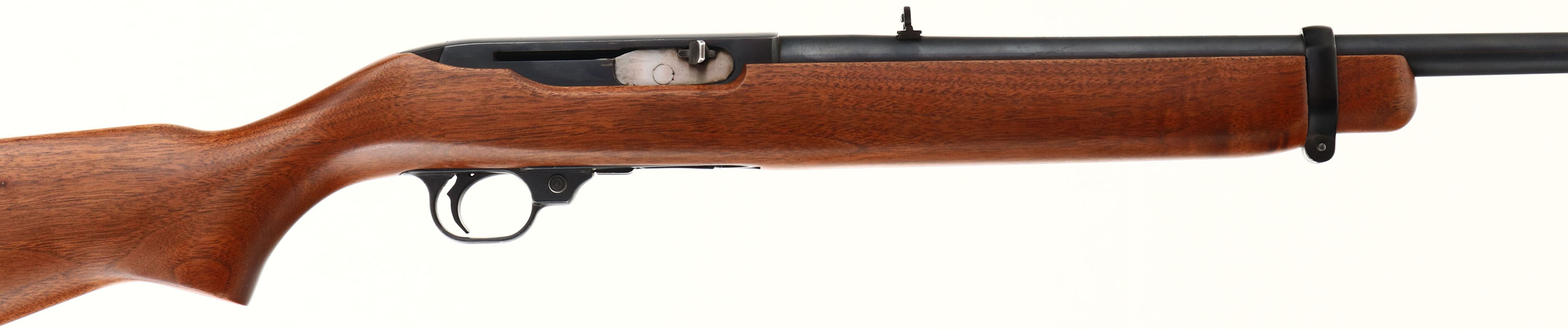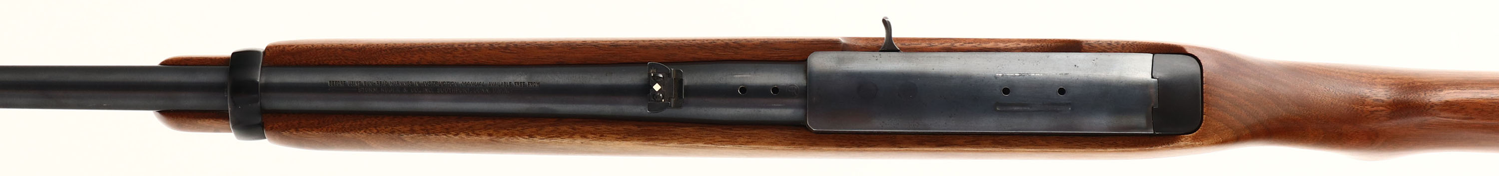 Ruger, Model 44 Carbine, CAL: 44 MAGNUM, MFG: 1980, SN: 102-86319, Semi-Auto Rifle, 18 1/4'' barrel. The original flat pistol grip wood stock is excellent, with the original finish. There are very few tiny handling marks. The metal blue finish on the barrel rates 98%. The receiver has two factory tapped holes on the top which have been professionally filled & the receiver has been nicely refinished. The top of receiver & back end of the barrel both carry four open holes from previous scope mounting. The barrel carries a flip-up rear sight & elevated blade front sight. Bore is excellent. Buttstock carries a smooth plastic carbine style buttplate. A very nice carbine. FFL Req. - Value: 400 to 800