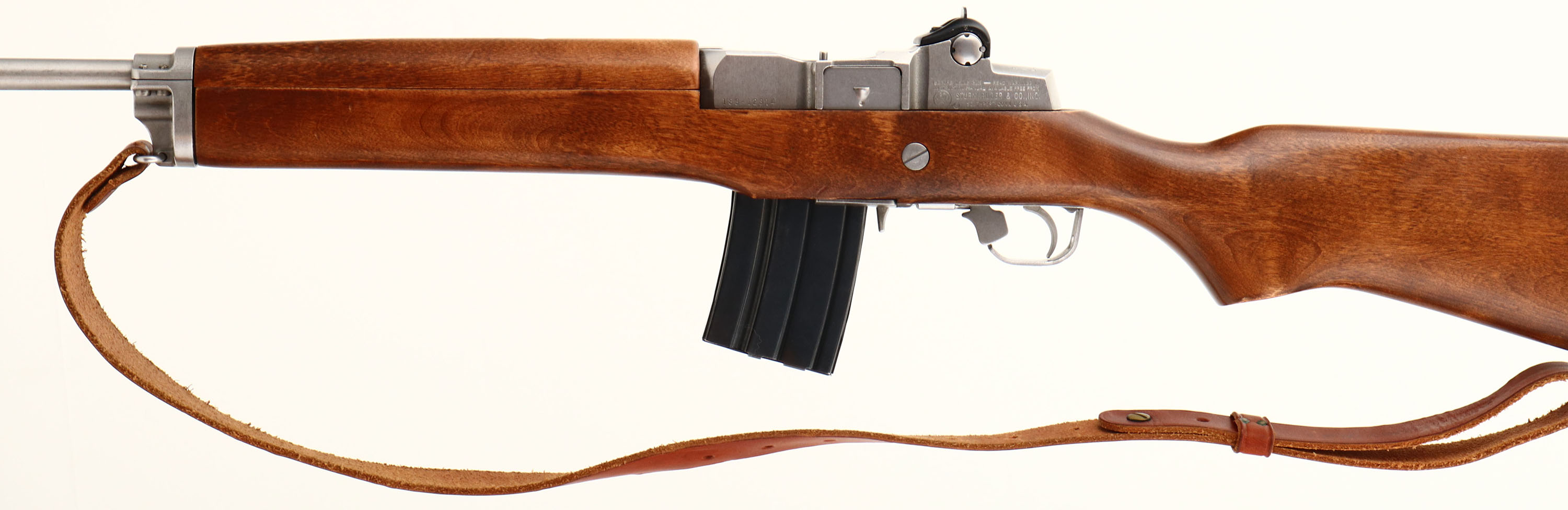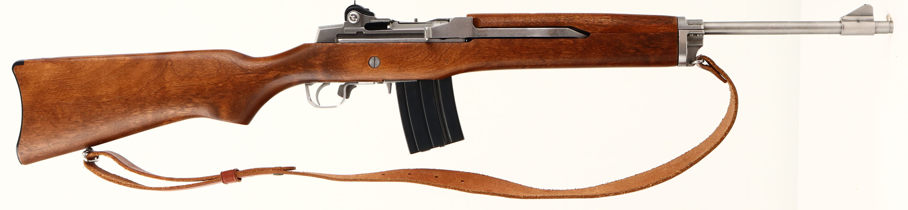 Ruger, Model Mini 14 Ranch Rifle, marked 223 Cal., MFG: 1982, SN: 183-12314, Semi-Auto Rifle, 18 1/2'' Round barrel, Factory hardwood stock is excellent, with original finish & very few tiny contusions. The stainless steel metal finishes are excellent. Factory Ruger plastic buttplate. Ruger marked factory mag. Bore is minty. Receiver carries a factory adj. folding ghost ring aperture rear sight & tall blade front sight. Factory sling loops carry a leather sling. An overall excellent original stainless mini 14. FFL Req. - Value: 800 to 1200