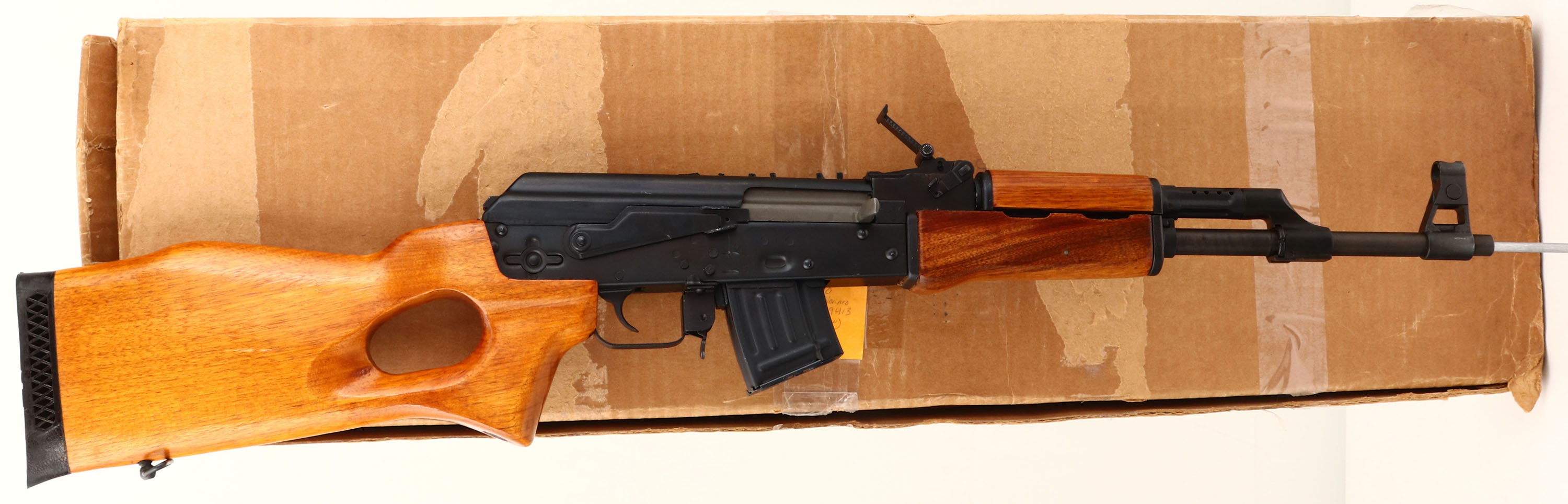 BOXED, Norinco, MAK90 Sporter, CAL: 7.62x39, MFG: 1990-94, SN: 31009413, Semi Auto Rifle, 16 3/8'' barrel. The original ambidextrous thumbhole wood stocks are excellent, with a few tiny storage contusions & scuffs. The metal finish rates 99% on the barrel & milled receiver, with minor storage blemishes. Bore is excellent, with sharp rifling. Adjustable 0 to 800 rear ramp sight & standard front sight. Buttstock carries a ventilated black rubber recoil pad. (1) Magazine. Basically, NIB in original box. A fun addition to any shooters collection. FFL Req. - Value: 800 to 1600