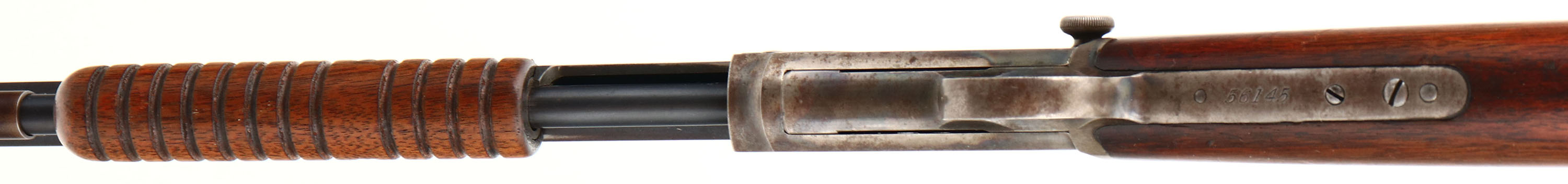 Winchester, Model 1890, 2nd Variation, CAL: 22 LONG, MFG: 1898 SN: 56145, Pump Action Rifle, 24 3/8'' Octagon barrel. The original straight grip wood stock & corncob style forend are excellent & solid. They carry the original finish thinning in areas of carry & display several minor contusions, dings & surface scrapes. The original metal blue finish on the barrel & mag remains at 90% coverage & has toned to a plum/brown patina as it thins. The case-hardened receiver has a mix of fading case colors & muted outlines. Bore is very good. The barrel holds a fixed rear sight & standard front sight. Buttstock carries a smooth crescent metal buttplate. Smooth tight action. Collectible as an original case-colored antique rifle.* Antique, No FFL Req. - Value: 3000 to 5000