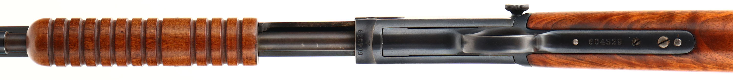 Winchester, Model 90, .22 LONG RIFLE Cal., MFG: 1916 SN: 604329, Slide Action Pump, 24'' Tapered octagon barrel. The L.R, only caliber is the rarest & most desired caliber amongst collectors as only 10% of total production were this caliber. The original wood is excellent & solid. The original finish is excellent, with a few very tiny finish level handling marks. The stock displays fantastic wavy grain. The original metal blued finish is 98% on the barrel, 95% on the receiver, & 80% on the mag tube. Bore is excellent. Barrel carries the original front & rear sights, Factory crescent steel buttplate, Excellent original example of a single caliber 90 remaining in very high collectible condition.* FFL or C&R Req. - Value: 3500 to 5000