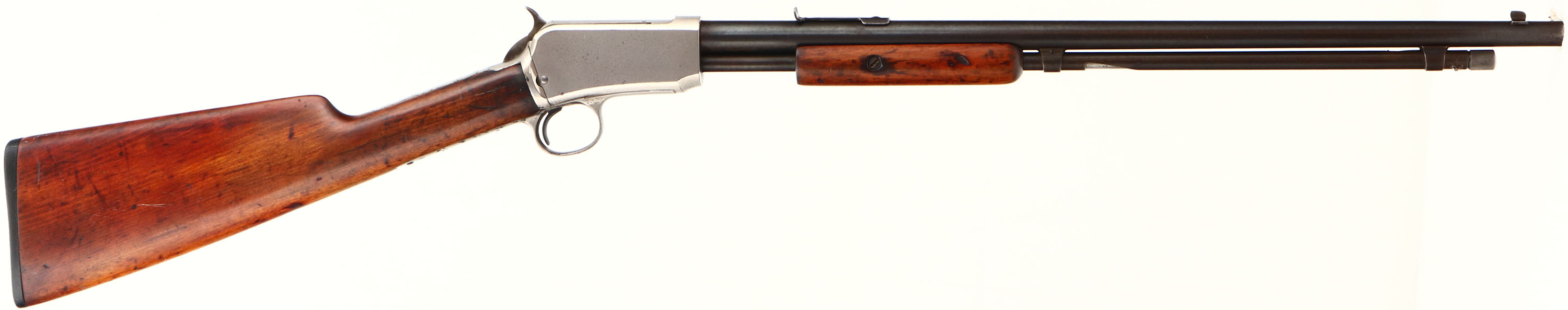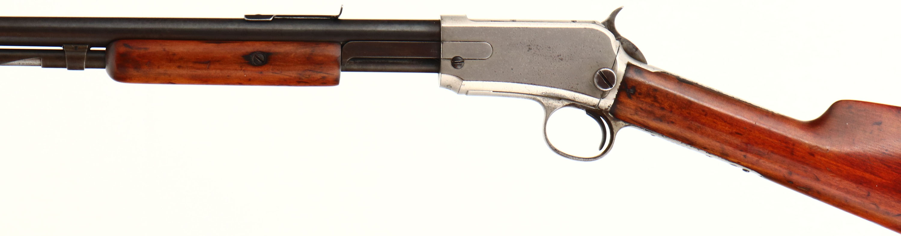 RARE Winchester, Model 1906 1/2 Nickeled GALLERY, .22 SHORT, MFG: 1906, SN: 18880, Pump Action Rifle, 20'' Round barrel, While nearly 700,000 Model 1906 rifles were produced, only a small percentage were nickeled & chambered in .22 Short only. The original gum wood stock are very good, with the original finish displaying numerous minor scratches, rubs & minor contusions. The metal blue finish on the barrel & mag has toned to a gray/brown tone, with approximately 70% coverage. The receiver carries the original special ordered nickeled finish with light speckling & edge flaking. Bore is excellent. Fitted with standard barrel sights. Mag tube has the rare wide cut short caliber feeding slot meant for quick loading in shooting galleries. Winchester plastic buttplate. A rare & collectible nickeled Short only rifle.* FFL or C&R Req. - Value: 2000 to 4000