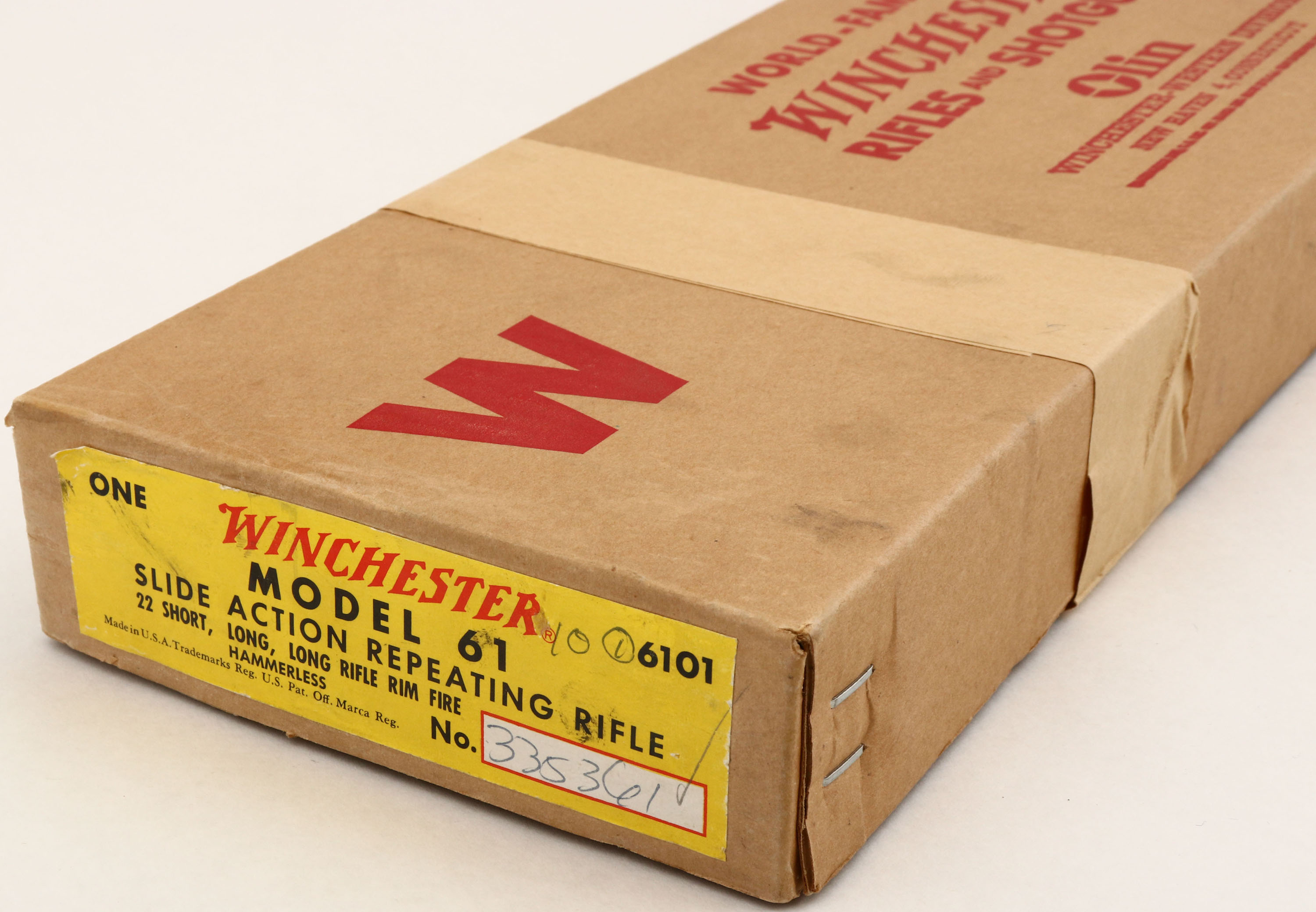RARE SEALED BOXED Winchester, Model 61, CAL: .22 S, L or LR , MFG: 1962, SN: 335361, Pump Action Rifle, 24'' Tapered round barrel, Do the gun being SEALED IN THE ORIGINAL BOX, the gun should be NIB with maybe light storage marks. Box is stone cold mint with great label, Wonderful Collector Grade.* FFL or C&R Req. - Value: 6500 to 10000