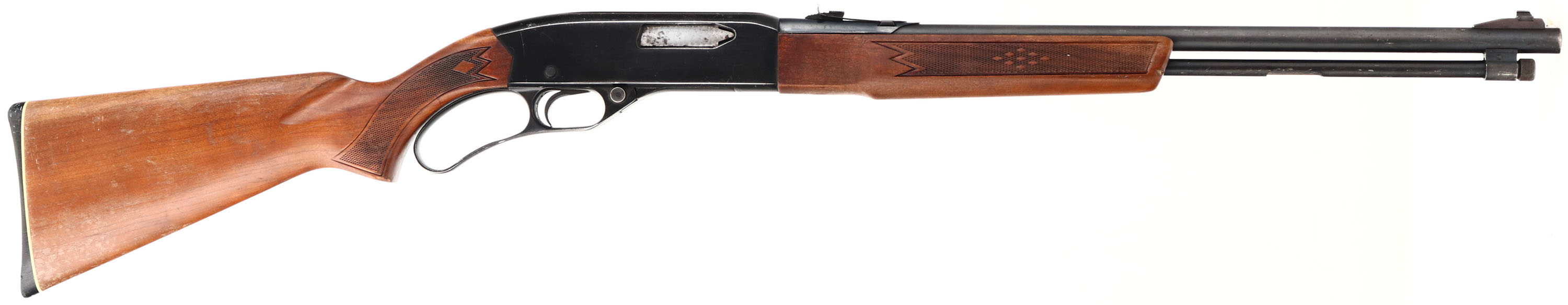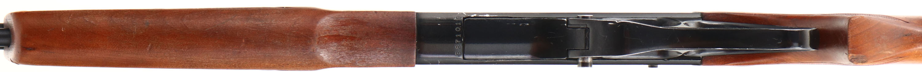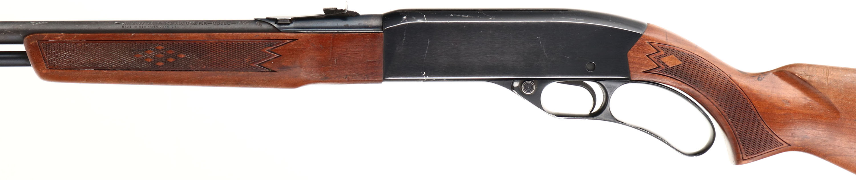 Winchester Model 255, CAL: marked .22 WIN MAG RF (WMR) MFG: 1964-70, SN: B871019, Lever Action Rifle, 20 1/2'' barrel. The original, pressed checkered & flat pistol grip stocks are excellent, with original finish showing some haze, several small handling marks, scuffs, scrapes & contusions. There is a small chip along the edge of the pistol grip. The metal blue finishes rate 80% overall. Bore is excellent. The barrel carries an adjustable rear elevator sight & ramp front sight. Buttstock carries a Winchester marked black plastic buttplate, with whiteline spacer. Jeweled bolt. A very nice original rifle. FFL or C&R Req - Value: 250 to 500