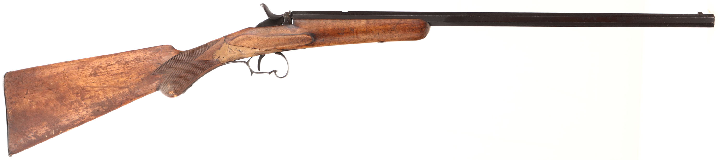 National Arms Co, Flobert Rifle, CAL: 22 Flobert, MFG: Antique, SN: N/A, Belgian Breech Loading Single Shot, 22 1/2'' barrel. The original checkered round knob pistol grip wood stock has multiple breaks, cracks & a fairly crude putty filled repair at the wrist. The stock has worn most of the finish away & has numerous other scratches, scrapes & contusions. The metal has entirely toned to a brown patina. Bore is dark, with roughness amongst worn rifling. The barrel has a open rear dovetail & holds a small blade front sight. Buttstock carries a smooth metal buttplate. Antique, No FFL Req. - Value: 80 to 150