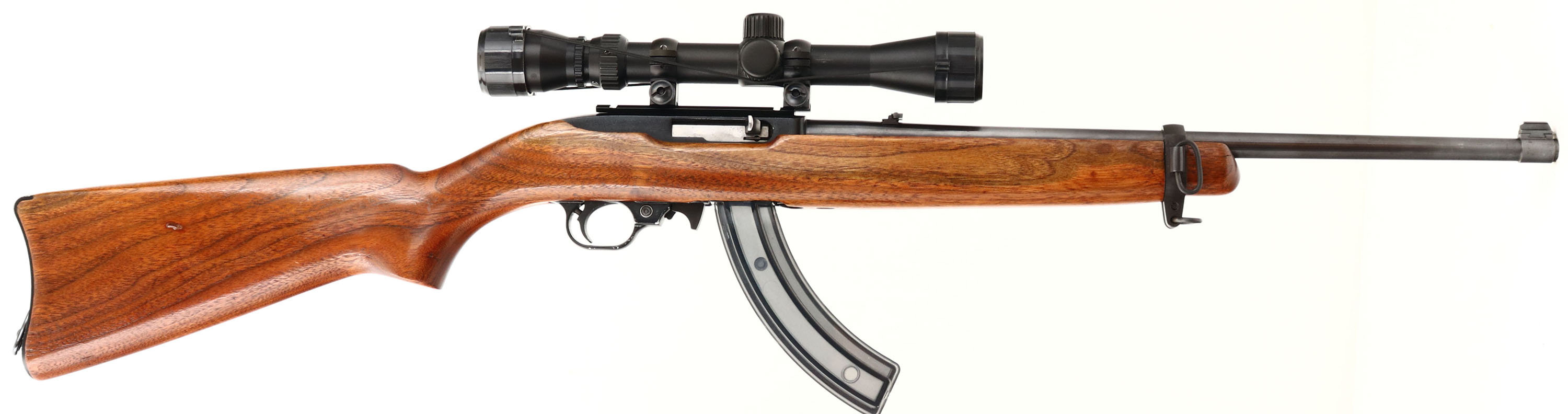 Ruger, Model 10/22 Carbine, CAL: 22LR, MFG: 1966, SN: 2720, Semi-Auto Rifle, 18 1/2'' barrel. The original flat pistol grip wood stock is excellent, with an added layer of finish & minor contusions & handling marks. The metal blue finish on the barrel rates 98%, displaying light scratches & the receiver has a restored black finish, also rating 98%. Bore is excellent, with defined rifling. The rifle is fitted with a Bushnell 3x9 scope, while the barrel has a folding leaf rear sight & elevated blade front sight. Buttstock carries a carbine stylet metal buttplate. Dual sling swivels on front barrel band & on the buttplate. Comes with (2) 25rnd mags. A nicely restored carbine & a great shooter. FFL or C&R Req. - Value: 400 to 600
