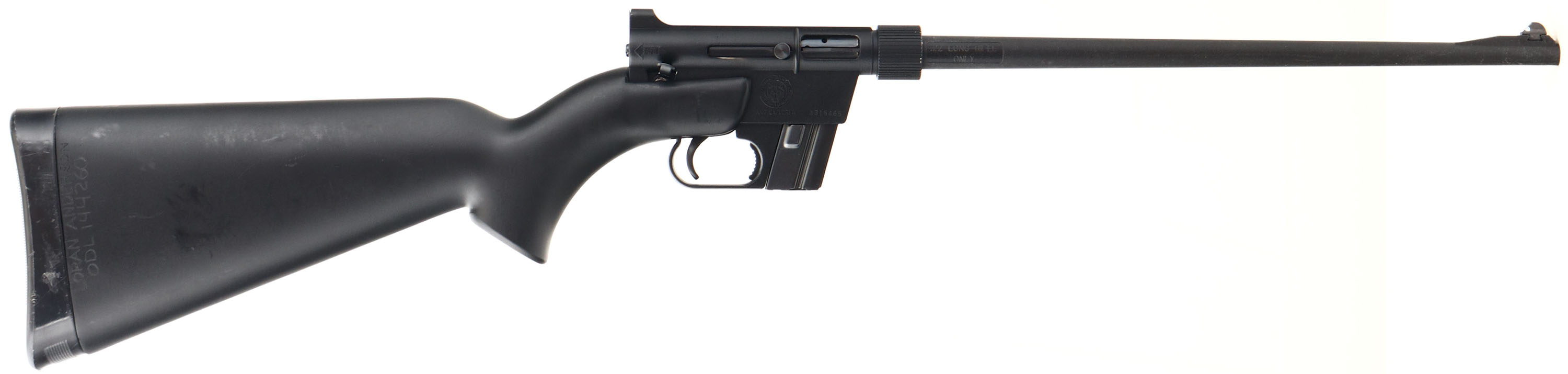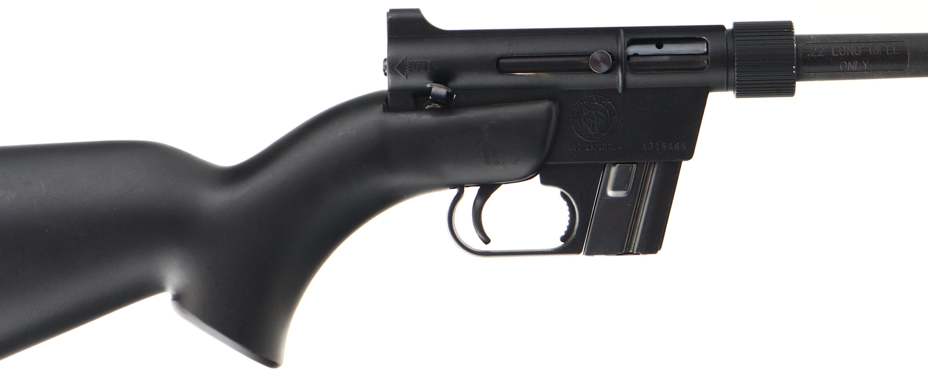 Charter Arms, Model AR-7 Explorer, CAL: .22 LR, MFG: 1960's, SN: A315465, Semi-Auto Rifle, 16'' detachable barrel. The factory flat pistol grip, black synthetic stock is very good, with several minor scuffs or scratches. There is an individuals name & DL# electric pencil engraved on the right side of stock near the butt cap. The original metal blue finish rates 95% on barrel, mag & receiver, which can all be dismantled & stored in the stock. Bore is excellent. Factory sights. Stock carries a black plastic buttplate or cap, which is removable to access the parts storage compartments. A great little backpack or survival rifle. FFL or C&R Req. - Value: 150 to 250