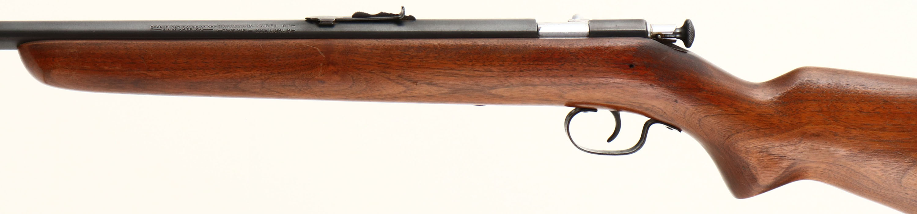 RARE Winchester, Model 67 Boys Rifle or Junior Variation, 22 S, L, or LR Cal., MFG. 1943-63, SN: None, Bolt Action Rifle, 20'' Round barrel. This is the rarer & more desirable ''Boys Rifle'' 4th issue of the model 67 with the shorter factory 20'' barrel. The rifle also has the factory heavier (no groove), flat pistol grip stock, with the slanted forend tip & a blued trigger. The stock is excellent, with the original finish thinning, light sanding & an added layer of protective oils. There are minor contusions & scratches. The metal blue finish has 95% coverage. Bore is excellent, but has a slight bulge 4'' from the muzzle. Mounted with the original sights. Winchester plastic buttplate. A very nice example of a Rare Boys Rifle. FFL or C&R Req. - Value: 200 to 500