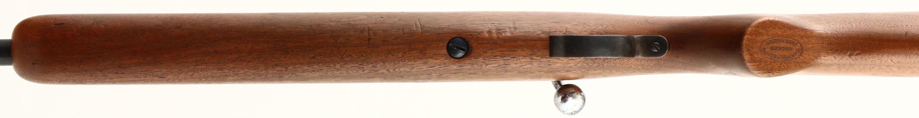 VERY RARE Winchester, Model 67 SMOOTH BORE, 3rd Issue, .22 SHORT, LONG AND LONG RIFLE Cal., MFG. 1937-63, SN: None, Take-down Bolt Action Rifle, 27'' Tapered round barrel, Sporting model, Marked ''SMOOTH BORE'' on left side of barrel. This 3rd issue rifle has the factory heavier (no groove), flat pistol grip stock, with the tapered forend, slanted forend tip, flush take-down screw, blued trigger & the earlier chamber marking. The factory flat pistol grip wood stock is excellent, with several small contusions & light handling marks. The flat of the pistol grip is stamped inside an oval ''MACPHERSON''S STORES INVERNESS'', which was a sporting good store & staple on Inglis Street, Inverness Nova Scotia from the early part of the 20th century until its closure in the mid 70's. The metal finish on the barrel has been professionally restored to 98% overall, with small areas of speckled pitting under blue. Bore is excellent. Mounted with original factory sights. Winchester plastic buttplate. A rare smooth bore example & in excellent condition. FFL or C&R Req. - Value: 500 to 1000