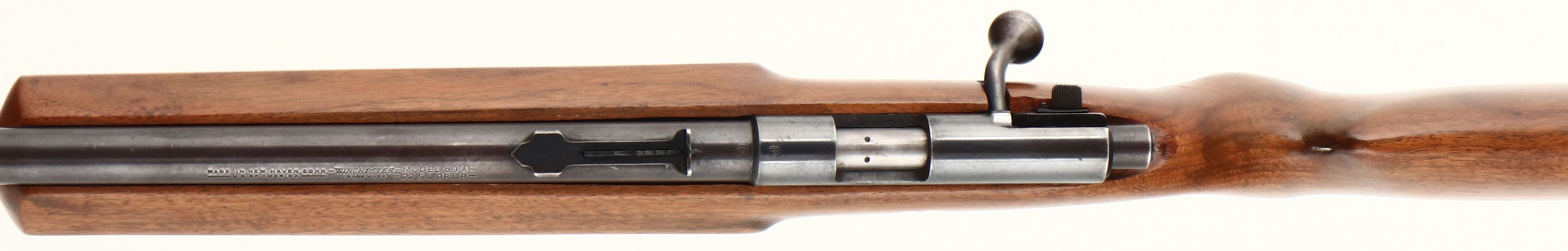 Winchester, Model 69-A, CAL: 22 S.L. or LR, MFG: 1935-63, SN: N/A, Bolt Action Rifle, 25'' barrel. The rifle carries a fantastic custom built bench or target style stock that fits like a factory stock. The flat pistol grip has a slight off-right setup, while the forearm has a wide flat side panel design. Finish & appearance is excellent, with very few light handling marks. The metal blue finish rates 90% on the barrel, 80% on barrel, with the barrel finish toning a gray/brown. Both receiver & barrel has some light pitting or speckling. Bore has good rifling, but there is a ring/bulge in the barrel 3 1/2'' from muzzle end, shouldn't affect accuracy much on a barrel of this length. The barrel holds a standard adjustable rear & an updated blade front sight. Buttstock carries a Winchester, checkered black plastic buttplate. ''W'' stamped detachable mag. FFL or C&R Req. - Value: 150 to 300
