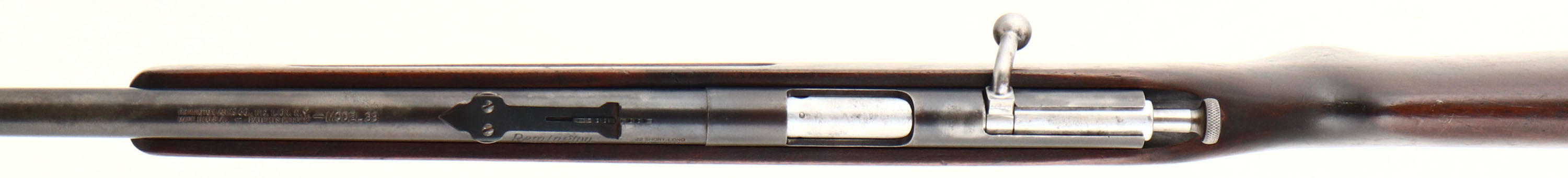 Remington, Model 33, CAL: 22 S,L,LR, MFG: 1931-35, SN: NONE, Bolt Action Rifle, 23'' barrel. The original flat pistol grip stock, with finger grooved forend is very good, displaying scratches, scrapes, contusions to the original finish. The metal finish has toned to a mix of remaining blue, gun metal gray & brown patina, with cleaned pitting throughout. Bore is excellent & bright. The barrel holds an adjustable rear sight & blade front sight. Stock carries a smooth metal buttplate. FFL or C&R Req. - Value: 100 to 300