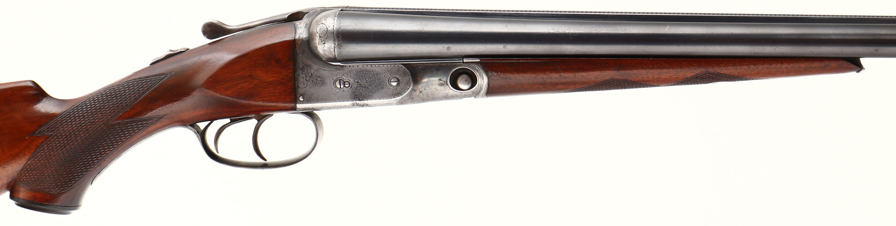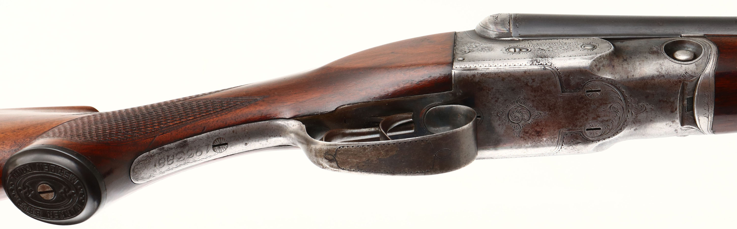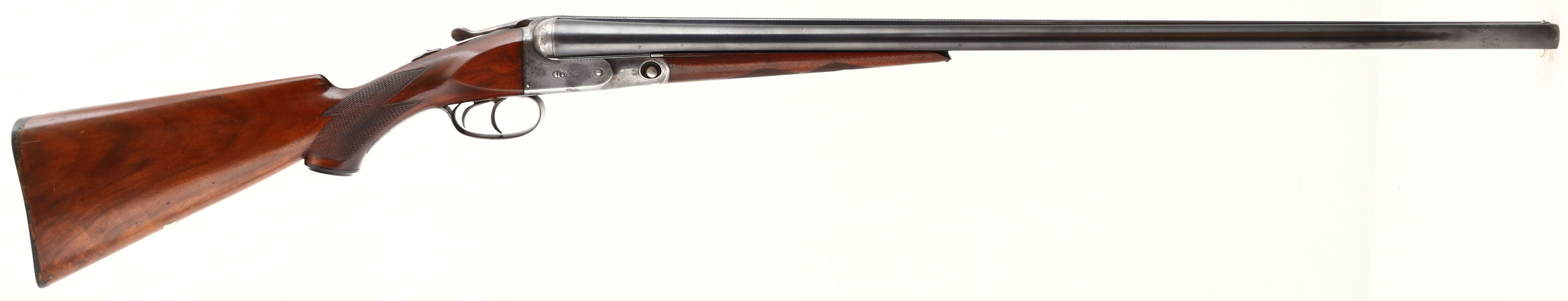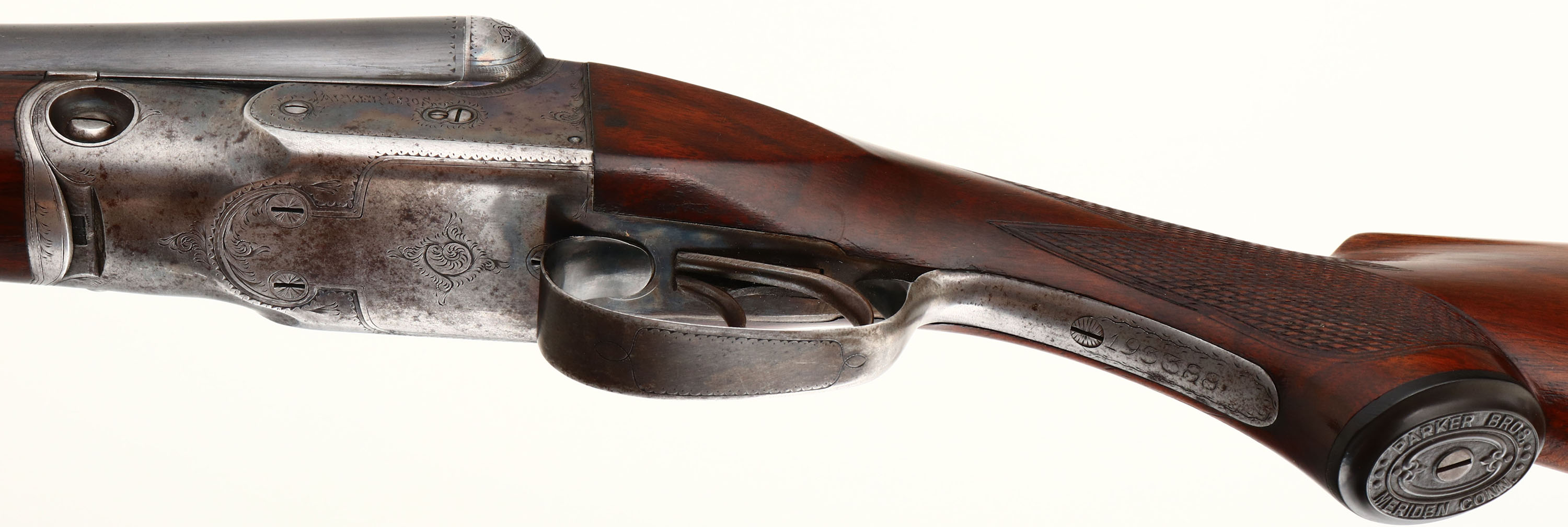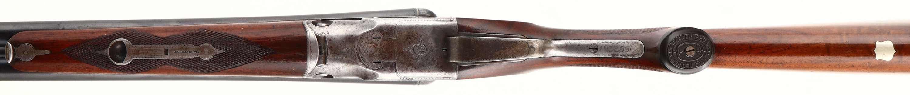 Parker Bros, Model PH or Grade 1, CAL: 16 GA, MFG: 1921, SN: 193388, Break Action SxS Shotgun, 28'' barrels. The original checkered capped pistol grip wood stocks are excellent, displaying minor scratches, scrapes & contusions. The stock appears to carry the original finish, while the forend carries the same original finish, with added thin layer of finish. The metal blue finish on the barrels rates 85% overall, with a couple of small contusions to the bottom of the right barrel, mid barrel, & other minor blemishes. The case-hardened receiver, retains faded outlines of case-colors, with more colors remaining in protected areas. The receiver, trigger guard, break lever & forend metal components all display simple scroll work & ornamental border engravings. #1 stamped on barrel lug. Bores are very good & bright, with visible striations from honest use. The solid matted rib holds a single front bead. Stock carries an original checkered/ dog's head Parker buttplate. A very nice example that present well. FFL or C&R Req. - Value: 1000 to 2000