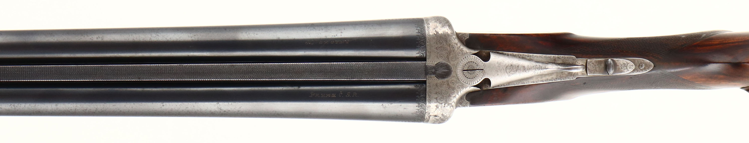 J. Nowotny SxS Shotgun, CAL: 16 GA, MFG: N/A, SN: 15909, Break Action Shotgun, 28 3/8'' barrels. The top of the barrels read, in crude writing ''J. NOWOTNY'' & ''PRAHA C.S.R''. The original checkered, beaded cheek & capped pistol grip wood stocks are excellent, as partially lightly sanded or cleaned & carrying an added layer of finish over the original finish. The metal blue finish on the barrels rates 90% overall, with some rust speckling. The receiver & trigger guard are silver finished, with a thin aged dullness. The receiver is beautifully engraved with ornamental scroll work & game scenes. On the left side of the receiver there's a dog & quail game scene, on the right a dog & pheasant game scene. on the bottom a bull elk & on the trigger guard a perched turkey. All of these game scenes & vignettes are accompanied by intricate ornamental scroll work. Bores are excellent, with some striations. The solid matted rib holds a single front bead. Buttstock carries a grooved plastic buttplate. The pistol grip cap has a couple minor edge chips. Sling loops present. A finely crafted SxS shotgun. FFL or C&R Req. - Value: 1000 to 2000