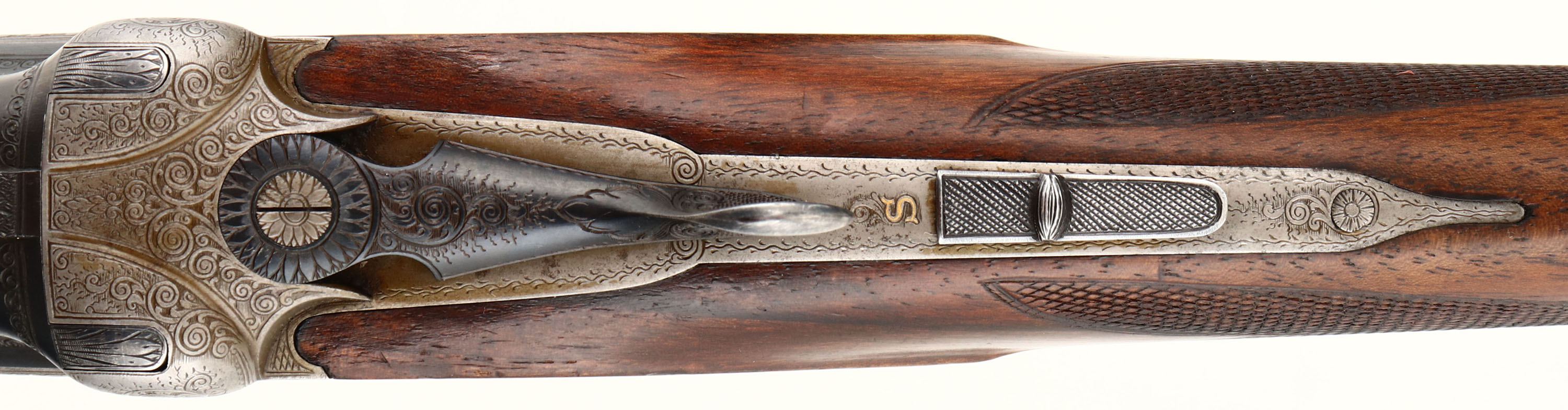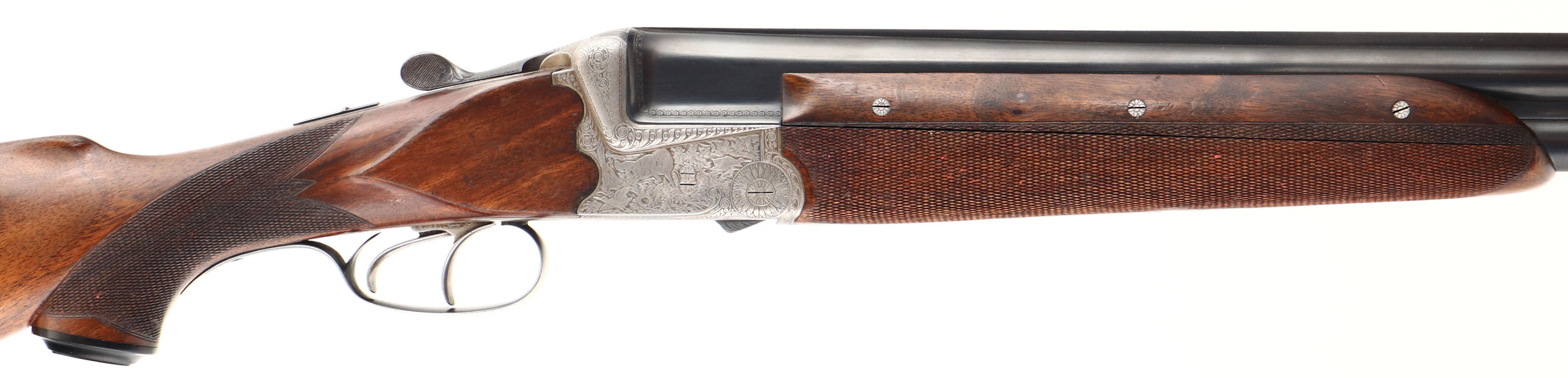 Franz Sodia, Ferlach, CAL: 12 GA, MFG: 1950's, SN: 2916, Break Action O/U Shotgun, 28 1/2'' barrels. The original, checkered, beaded cheek, & capped pistol grip wood stock & three piece forend are excellent, displaying minor contusions & surface scrapes to the finish. The metal blue finish on barrels rates 95% overall, with light scuffs & blemishes. The receiver is coin silver. The entirety of the receiver, trigger guard, break lever, forend metal components & screws are all beautifully & intricately hand engraved. The receiver displays multiple game scenes; on the left a pointer & two quail, on the right a fox & two woodcocks, on the bottom two mallards, as well as a variety of ornamental scroll work. Bores are excellent. The solid rib holds a single front bead. Buttstock carries a solid black rubber recoil pad. Sling loops present. Double triggers. A truly outstanding example of a high grade Austrian shotgun. FFL or C&R Req. - Value: 1500 to 2500