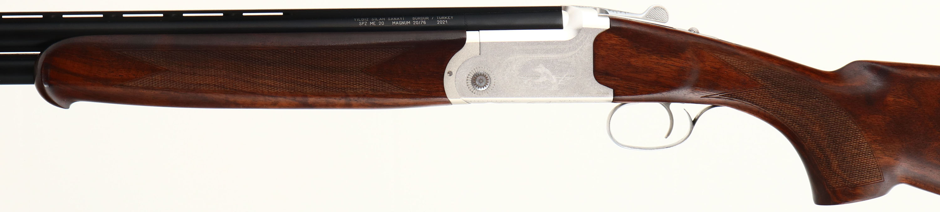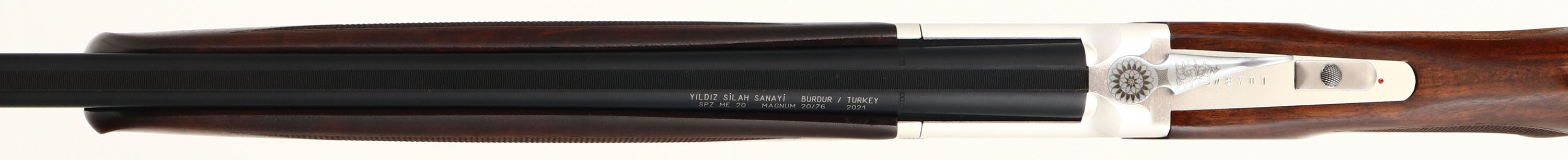 NEW, Yildiz, SPZ ME/20, CAL: 20GA, MFG: Modern, SN: U78701, Break Action O/U Shotgun, Choke: 5pc Mobil choke System, 28'' barrel with dual ventilated rib. The deluxe Turkish walnut, checkered flat pistol grip wood stocks are excellent. The 7075 white alloy receiver is excellent & the metal blue finish on the barrels rates 100%. The receiver, trigger guard & break lever display an intricate engraving, a duck on either side of the receiver in a pond setting, a dove on the bottom in a similar setting & ''YILDIZ SILAH SANAYI'' also on the bottom, next to the trigger guard. All engravings are bordered by an attractive ornamental/floral pattern. Bores are excellent. The barrel holds a single front bead. Buttstock carries a solid black rubber recoil pad. Comes in box with original packaging, owners manual, choke tool & extra chokes. This is a NIB gun, never fired. A great addition to any collection! FFL Req. - Value: 1200 to 1800