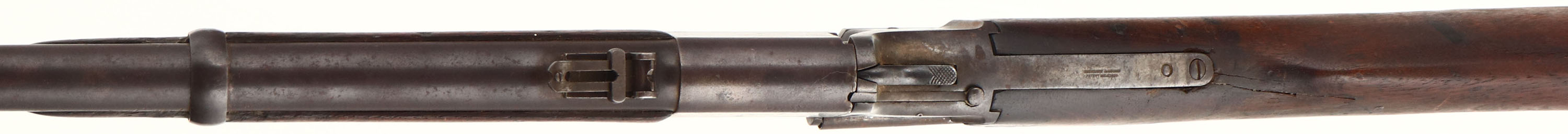 Meriden Manfg Co., Model ''Triplett & Scott Rifle'', CAL: 50 R.F, MFG: 1864-66, SN: 4056, Swivel Breech Loading Rifle, 30'' round barrel. The straight grip American walnut stock & forend are fair. There is a 5 1/4'' glue repaired break/crack left side of the wrist, several small grain cracks on the right wrist & a small 1'' crack on the left side by the buttplate. The stocks still remain solid after repairs & displays small contusions, scrapes, nicks & dings. Marked on left side of receiver in two lines, '' MERIDEN MANGF. CO.'', ''MERIDEN CONN.'' On upper receiver tang: ''TRIPLETT & SCOTT - PATENT DEC 6, 1864''. The right side of the frame is stamped with the full SN. The metal surfaces all carry a rust brown patina, with rust pitting & speckling. The barrel holds a flip-up ladder rear sight, with no graduation marks & a heavy inverted ''V'' blade front sight. Bore is good, with spotty areas of pitting near the muzzle. Buttstock carries a smooth, curved metal buttplate. The unique action appears to function properly. This rifle was issued to Kentucky Home Guard troops who were assigned to protect the supply lines of the Union Army under General Sherman's command. A unique & truly strange two-piece design, with the breech face, firing controls, magazine & buttstock as the rear most assembly, attached to the firing chamber, barrel & forend assembly by a pivoting joint. The gun used a seven round tubular magazine in the buttstock, similar the Spencer, but not removable. The magazine tube is situated off center to the left, along the toe line of the stock. This design left almost no wood in the buttstock over the magazine tube & left the wrist very weak. Every Triplett & Scott has a severe cracks, & often wood loss, as seen in this example as well. To operate the action, the hammer is placed on half cock, & a thumb release catch depressed on the rear of the receiver. This allowed the shooter to rotate the forward half of the receiver to the right (clockwise) & as the forward portion rotated an automatic ejector would extract the spent cartridge case from the receiver, dumping it on the ground. As the forward portion of the receiver was rotated further around, it pushed a spring-loaded door open, which covered the magazine tube. This allows a cartridge to be fed into the firing chamber. Rotating the action back to the left (counter clockwise) closes & locks the action & cocks the hammer fully making the gun ready for firing. While this seems like a complicated system, it did work well & with training, a solider could operate the gun with some efficiency. Antique, No FFL Req. - Value: 800 to 1500