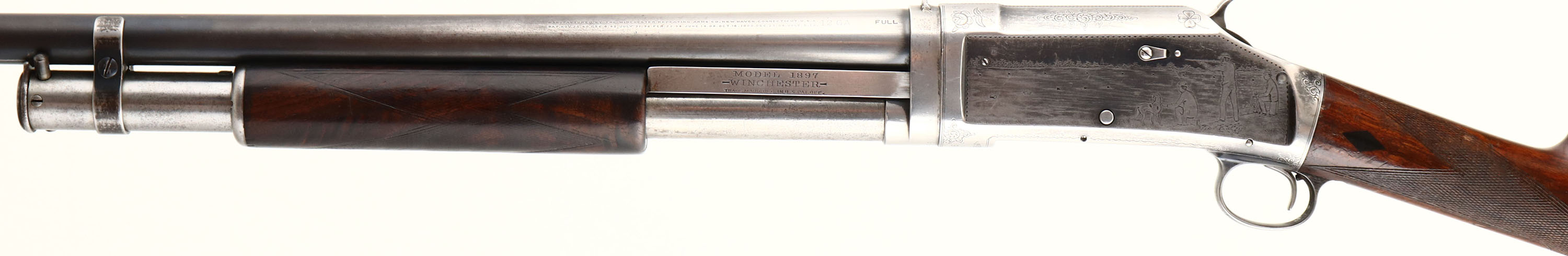 RARE Winchester, Model 1897 Engraved Pigeon Grade, 12 GA., MFG: 1913, SN: 585896, Pump Action Shotgun, 32'' no rib barrel, Full choke, Black Diamond Pigeon Grade, Take down, The original deluxe checkered & straight grip wood stocks are very good & solid. They display the original finish, with an added layer of finish to the stock & a few minor finish level scuffs or dings. The forearm has darkened from use & much of the original checkering has worn smooth. Black diamonds located in the wrist. The original metal blue finish rate 30% overall. Receiver displays panel scene engraving of a live pigeon shoot on the left, grouse hunter & dog on the right, & American scroll & border engraving on the underside& trigger guard. There is an engraved standing pigeon located behind the hammer. Trigger guard is also factory engraved ''P. J. FORD.''. There is a story this shotgun was presented to or at least was owned by an early member of the Ford automobile family, but no records or documents exist to prove that prominence. All engraving, lettering & address are legible. A fixed ''V'' rear sight has been added to the bridge of the receiver, while the barrel carries a single gold bead. The bore is very good. Stock carries a hardened solid red recoil pad. Esthetically, a very nice example of a fairly rare shotgun. FFL or C&R Req. - Value: 3000 to 4500