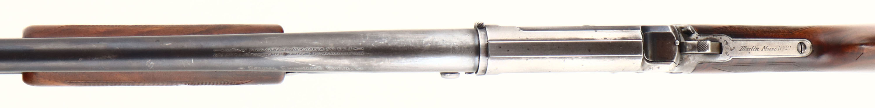 RARE ENGRAVED Marlin, Model No.21 ''C'' Grade, CAL: 12GA, MFG: 1907-08, SN: 96095, Pump Action Shotgun, 30'' barrel. The checkered straight grip wood stock & forend are very good. They were lightly sanded & refinished long ago & now display contusions, scratches, scrapes, & areas of finish thinning or worn dull. The stock does show very nice rippled grain. The metal finish on the barrel & tube has toned to a mix of metal gray & original remaining blue, while the receiver has worn almost fully gun metal gray, with small remnants of blue in protected areas. The receiver is factory engraved, with a group of flying mallards on the left, with bordered by ornamental scroll work, two doves on the slide, with ornamental style engraving on the rest of the right side of receiver. The SN on the bottom of the receiver is bordered by a floral/leaf pattern. Bore is excellent, with minor spotting. The barrel holds a single front bead. Buttstock carries a Marlin grooved plastic buttplate. The Marlin Model 21 was only listed in the catalogs for 2 yrs when it was replaced by the new, Marlin Trap Gun. The Model 21 was Marlin's the first straight grip shotgun, with a takedown system.* FFL or C&R Req. - Value: 1000 to 2000
