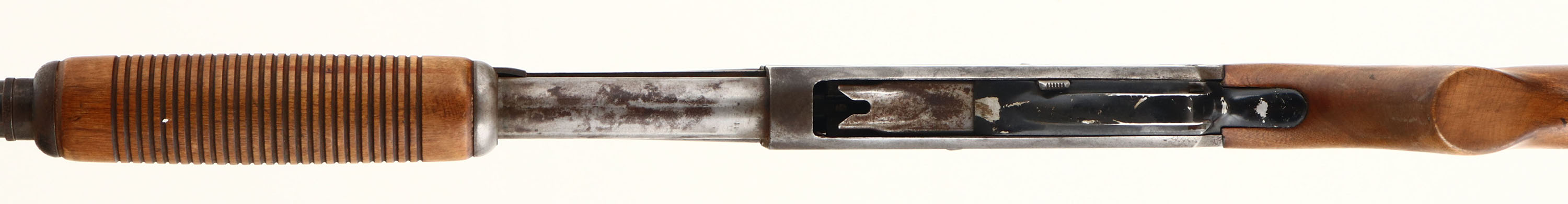 Springfield, Model 67H, CAL: 12 GA, MFG: 1967-89, SN: N/A, Pump Action Shotgun, 27 3/4'' barrel. The flat pistol grip wood stocks are good, with the stock having a wrap-around repaired crack on the top of the wrist. There are scrapes & dings to the original finish. The metal finish has worn to an uneven mix of metal gray & brown patina, with spotting & pitting throughout the metal surfaces. Bore is very good, with minor spotting near the muzzle. The barrel holds a single front bead. Buttstock carries a grooved plastic buttplate with a 1'' edge chip. FFL or C&R Req. - Value: 100 to 300