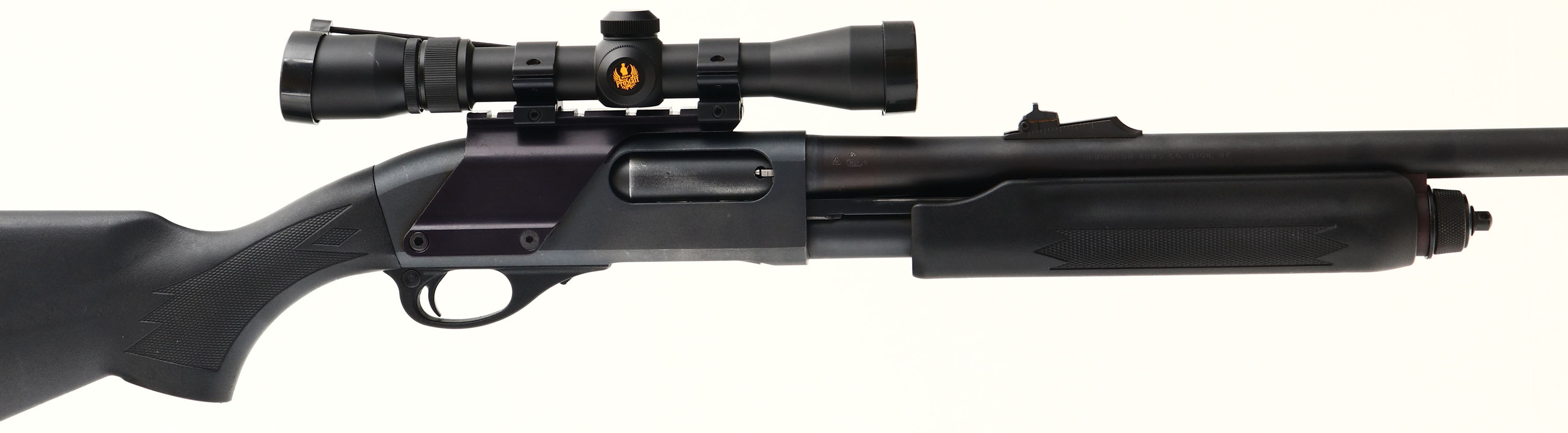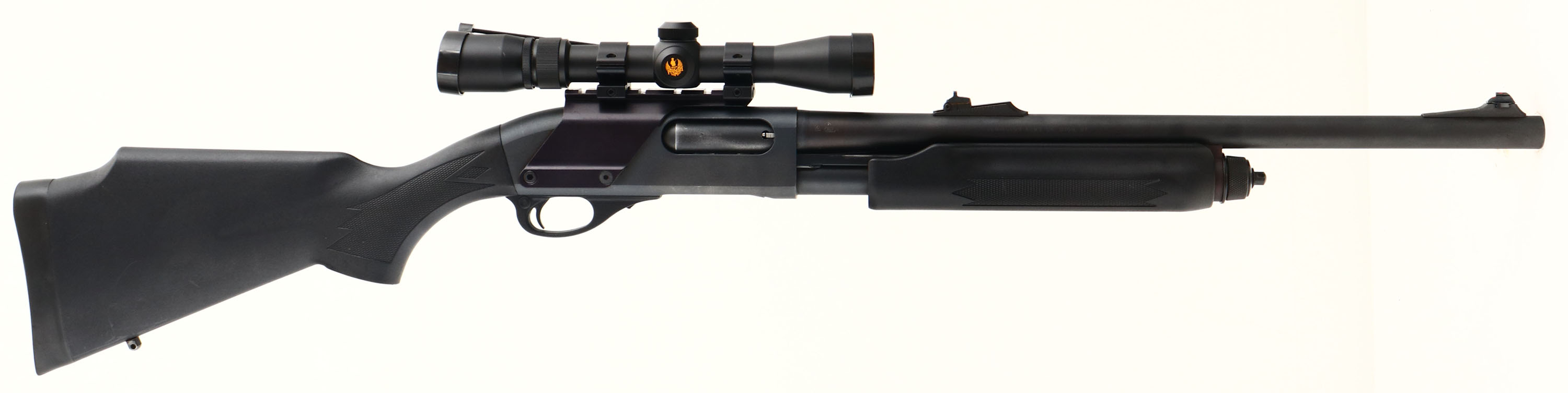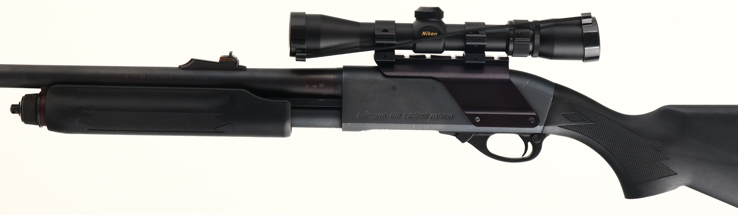 Remington, Model 870 Express Magnum, CAL: 12 GA, MFG: 1989, SN: 0501704M, Pump Action Shotgun, 19'' fully rifled barrel. The checkered &, flat pistol grip Monte Carlo style stocks are excellent, displaying minor handling marks & light scrapes. The parkerized finish on the barrel, receiver & mage tube is excellent. Bore is excellent. The receiver holds a Nikon ProStaff 2x7 scope, held by a receiver mounted picatinny rail. The barrel holds an adjustable rear & ramped blade front sights. Buttstock carries a Remington solid recoil pad. Sling studs present. A set up & ready for the hunt shotgun. FFL Req. - Value: 500 to 800