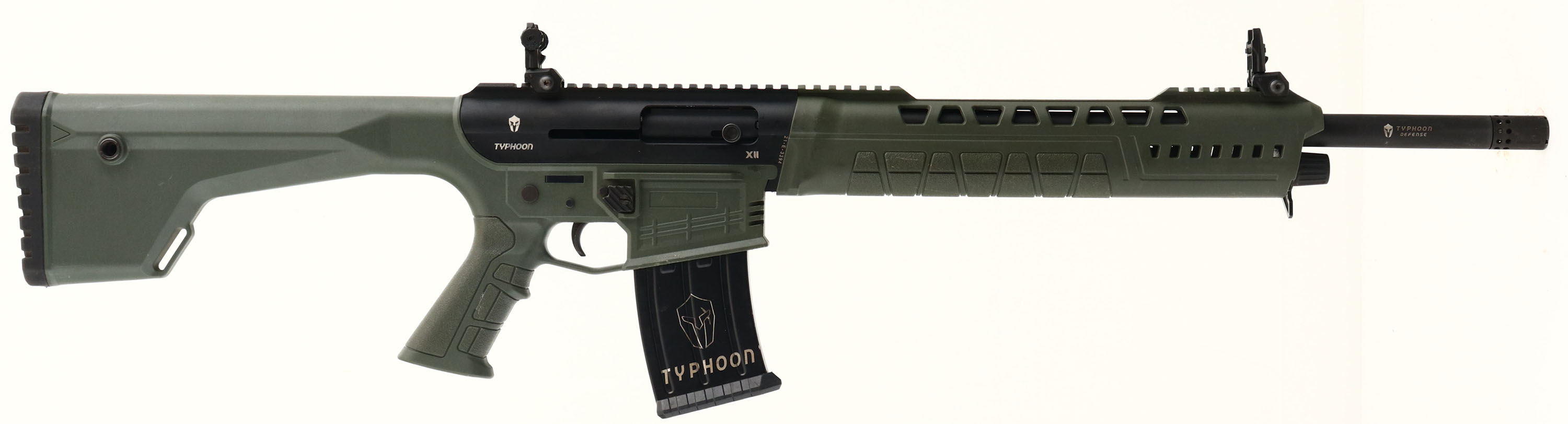 Typhoon, Model XII, CAL: 12GA MAGNUM, MFG: Modern, SN: 21-E-3994, Semi Auto Shotgun, 3'' chamber, 18 1/2'' barrel w/o muzzle brake. The textured grip army green synthetic stock is excellent, displaying minor scratches & scrapes. The matte black finish on the barrel & receiver is excellent, displaying some light use wear. Bore is excellent. The frame has integrated picatinny rails, which hold a set of flip-up sights. Buttstock carries the original grooved, solid recoil pad. Integral sling loop & quick connect docks. The detachable mag has a missing chip from the plastic base. A very good self defense & AR style shotgun. FFL Req. - Value: 400 to 800
