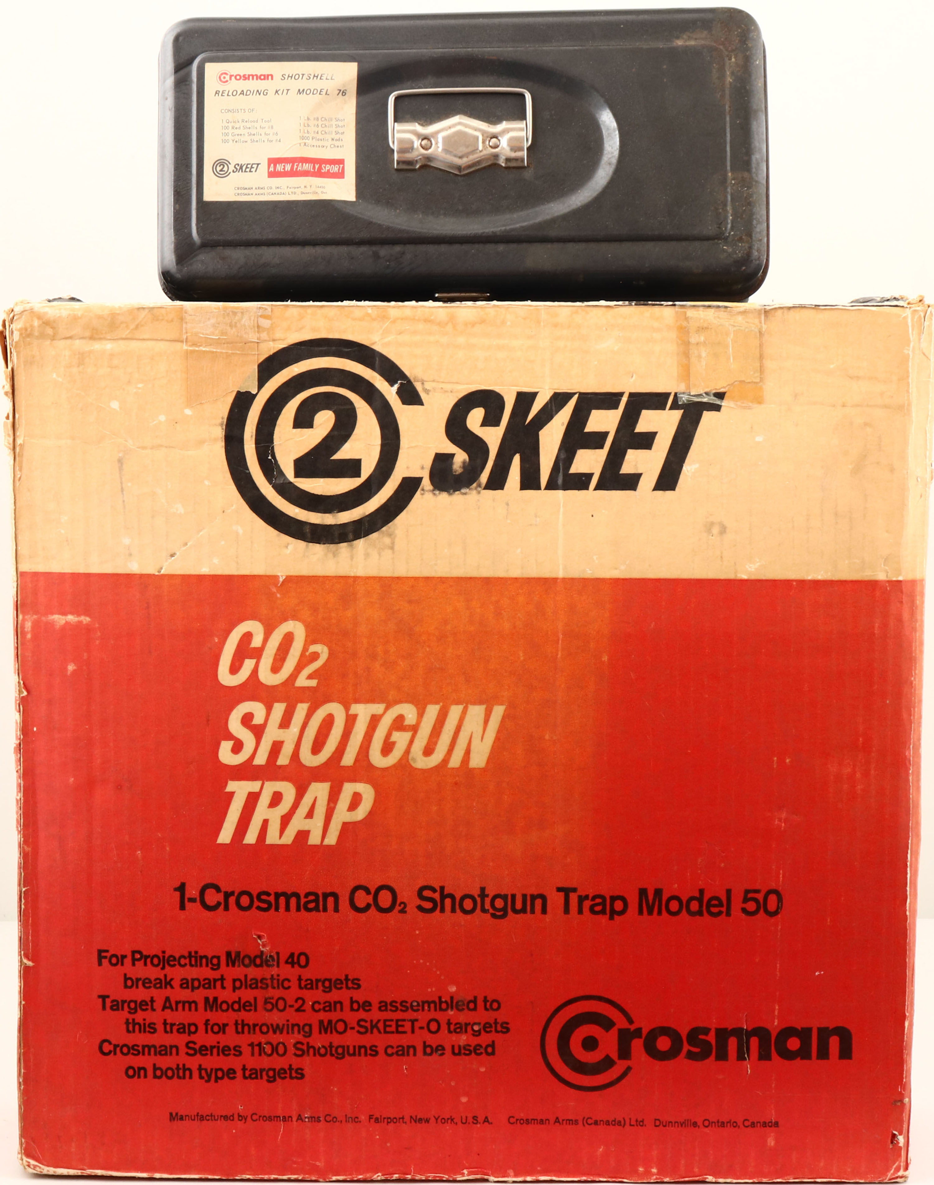 RARE!! Crosman Arms, Trap Master 1100, CAL: No.8 Shot/Crosman Co2 Shotshells, MFG: 1968-71, SN: 616069, Co2 Powered Shotgun, 28'' Ribbed barrel. The flat pistol grip wood stocks are excellent, displaying minor handling marks to the original finish. The metal black finish on the barrel & receiver is excellent, rating 99% overall, with a few minor blemishes or scuffs. Bore is mint. The barrel holds a single front bead. Stock carries a grooved plastic buttplate. This is a rarely seen full set. It comes complete with all parts for the Trap Bench assembly in original packaging, with parts having light storage wear. Comes with (25) yellow plastic break-away targets in original Crosman box, original Crosman Shotshell Reloading Kit, with shells, BB shot & plastic wads, oil new in the package, owners manual, assembly instructions, shotshell reloading instructions, & a couple other paper articles. A seldom seen set, especially with all the correct, original parts in very high original condition. A wonderful addition to a Crosman collection! Air shotgun. No FFL Req. - Value: 500 to 1000