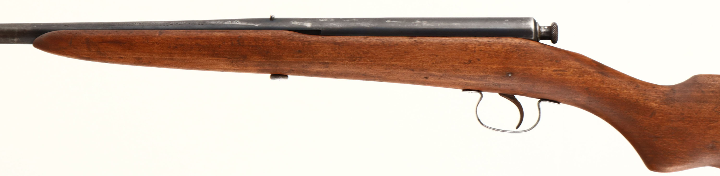 Winchester, Model 41, CAL: .410 GA, MFG: 1920-34, SN: NONE, Bolt Action Shotgun, Choke: F, 24'' barrel. The flat pistol grip wood stock is good, as lightly sanded & reoiled to a flat finish. The stock displays small scrapes, contusions & dings. The metal blue finish has worn to about 30%, with the balance being a mix of thin brown patina & gun metal gray. Bore is excellent. The barrel holds a small fixed rear sight & front bead. Stock carries a worn Winchester checkered buttplate, with edge chipping. A rather neat little bolt .410. FFL or C&R Req. - Value: 150 to 300