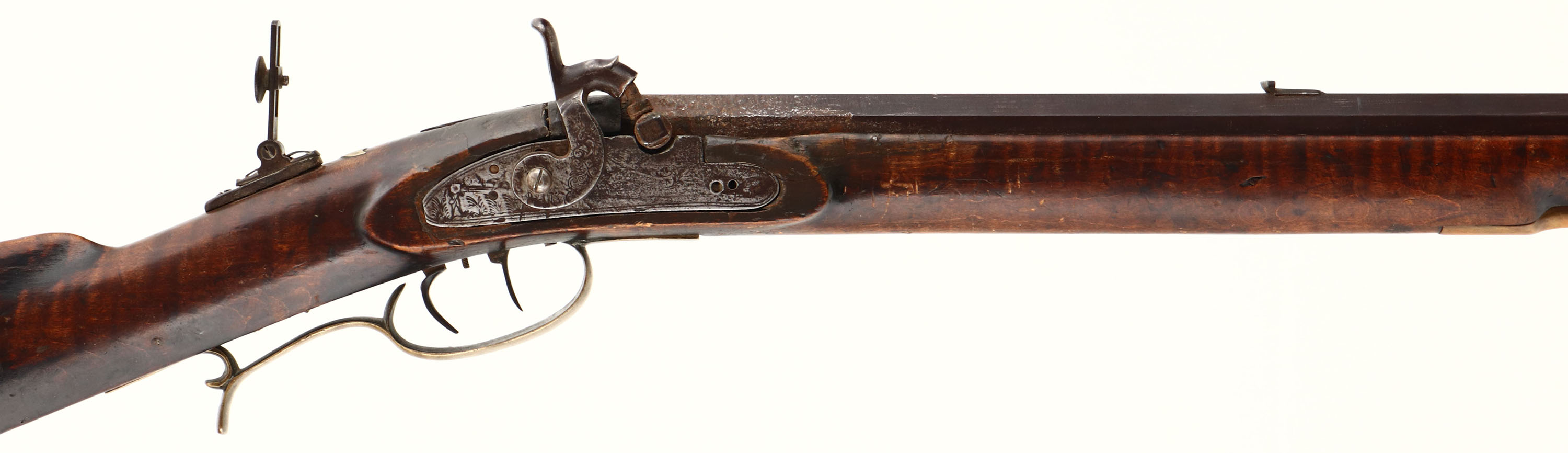 George Goulcher. Model: Kentucky Rifle. Cal: .38. MFG: Mid 1800's. S/N: N/A. percussion muzzleloader. 34 1/2'' octagonal barrel. The straight wrist cheeked wood stock is good with crack on top right side by hammer, cracks on both side by toe, scratches, dents, gouges & wear from use/age. Barrel has toned to a brown patina with rust & pitting near hammer. Bore is good, dark with strong rifling. Hooded post front sight, U-notch & tang flip up aperture sight, brass buttplate. Comes with ram rod. Muzzleloader No FFL Req. - Value: 100 to 300