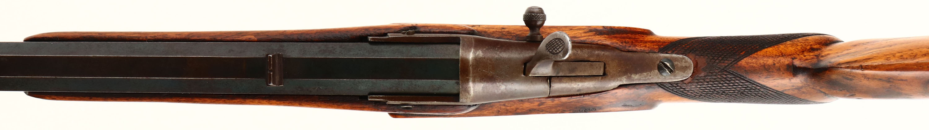 Belgian, Flobert, CAL: barrel marked FL.22.L (muzzle dia 0.465''), MFG: Antique, SN: 105, Breech Loading Single Shot Rifle, 23 1/2'' barrel. The refinished checkered round knob wood stock is very good, displaying contusions, scrapes & dings. The metal finish has toned to a mix of remaining blue & brown patina & the receiver has fully toned to brown patina. Bore is good, with visible rifling. The rifling appears crude, but looks original. The barrel holds a fixed notch rear sight & blank front dovetail. Stock carries a smooth metal buttplate. Antique, No FFL Req. - Value: 100 to 300