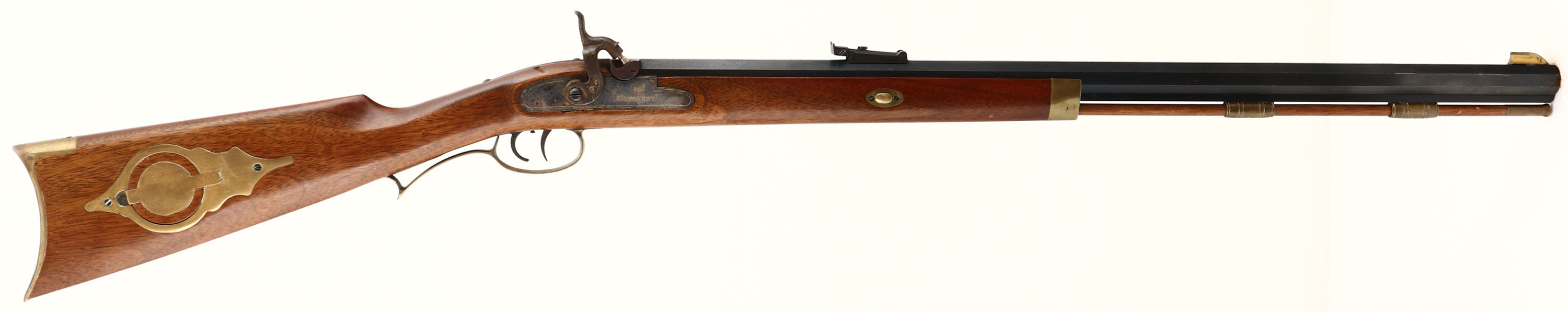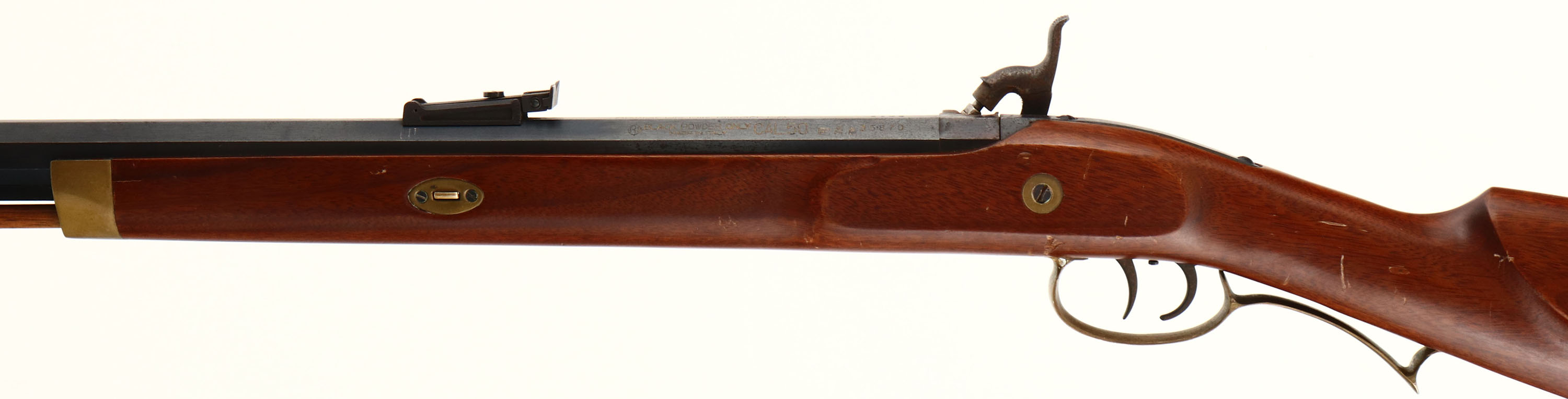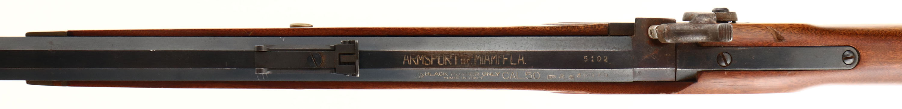 Armsport Inc., Muzzleloader, CAL: 50, MFG: N/A, SN: 35870, Percussion Black Powder Rifle, 28'' octagon barrel. The cheeked straight grip wood stock is very good, displaying nicks, dings & scrapes to the finish. The metal blue finish rates 80% overall, with spotting & speckling, toned to a brown patina. The side plate is case-colored, with case-colors remaining & spotting, toned to a brown patina. Bore is good & bright, with intermittent spotting. The barrel holds an adjustable rear sight & brass blade front sight. Stock carries a crescent brass buttplate. Ramrod present. Black Powder, No FFL Req. - Value: 100 to 300