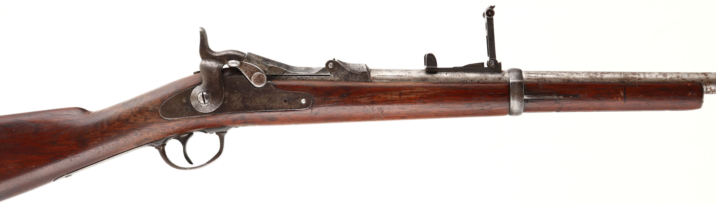 Springfield. Model: 1873. Cal: 45-70. MFG: 1883. S/N: 216284. Trapdoor Breech loader. 32 1/2'' Barrel. The straight wrist wooden stock is good, stock has been cut down, tight repaired crack at top of wrist that wraps around stock towards the receiver. Scratches, chips, dings, dents & wear from use/age, ''P'' in circle Cartouche on bottom of stock behind . Metal finish remain in protected areas with rest of metal worn to a gun metal gray or brown patina with rust speckling. Rear of receiver is marked with S/N, top of breech block is marked ''U.S. MODEL 1873'', left side of barrel is marked ''V'', ''P'' over eagle, ''P''. Bore is good with one spot of light pitting & light roughness. Hooded blade Front sight, V-notch tangent rear sight marked 100 to 6. Metal buttplate that's worn to a brown patina & has cleaned pitting, upper tang marked ''US''. No sling swivels. Antique No FFL Req. - Value: 200 to 400