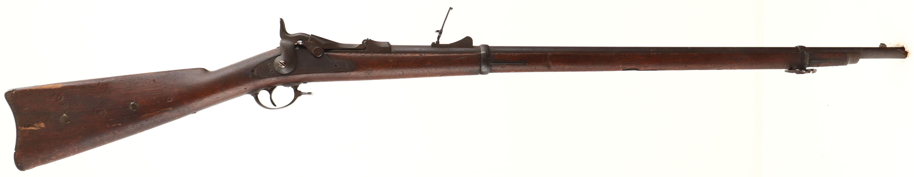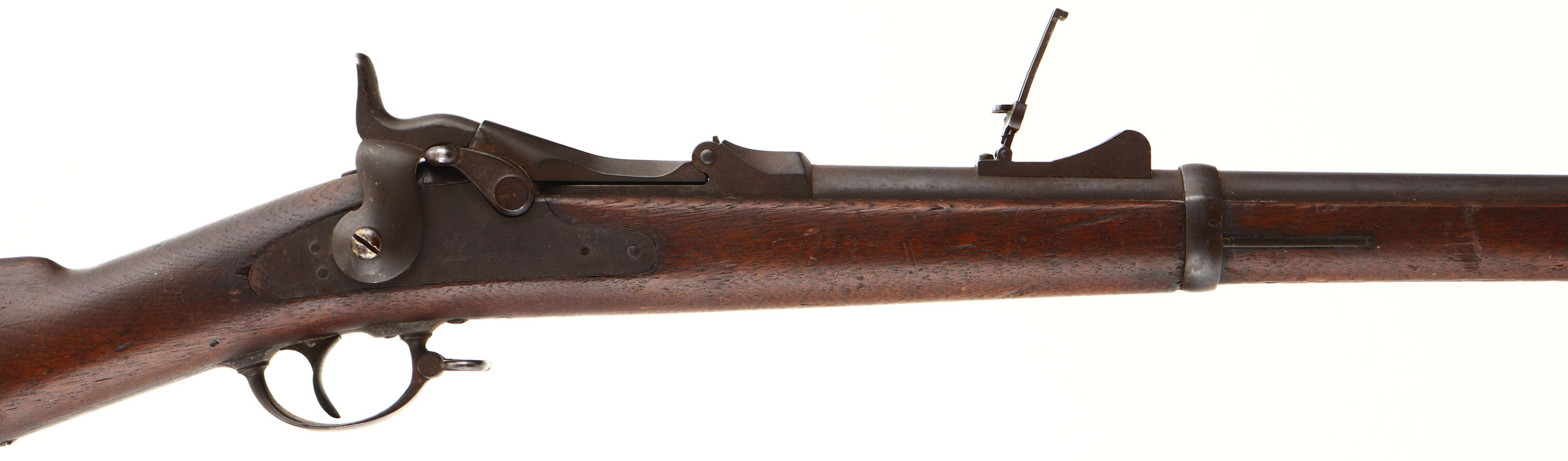 Springfield. Model: 1873. Cal: 45-70. MFG: 1883. S/N: 203667. Trapdoor breech loader. 32 1/2'' Barrel. The straight wrist wood stock is very good, two nails through stock that look to have used to hold in plaque on both sides, scratches, dents, gouges, chips & wear from use/age, ''JAM'' carved into left side of stock, ''P'' in circle cartouche on bottom of stock behind lower tang, Faint cartouche on left side of stock above trigger. All metal parts are worn to a even brown patina with rust speckling. Lock is marked with eagle, ''U.S. Springfield'', top of breech block is marked ''MODEL 1873'', rear of receiver is marked with S/N, left side of barrel is marked with ''V'' over ''P'' over Eagle, ''P'', both barrel bands marked with ''U''. Bore is fair with pitting & worn rifling. Front blade sight, Rear U-notch tangent sight. Metal buttplate worn to a even brown patina marked ''US'' on upper tang. Bottom sling swivel & stacking swivel, missing cleaning rod. Antique No FFL Req. - Value: 400 to 1000